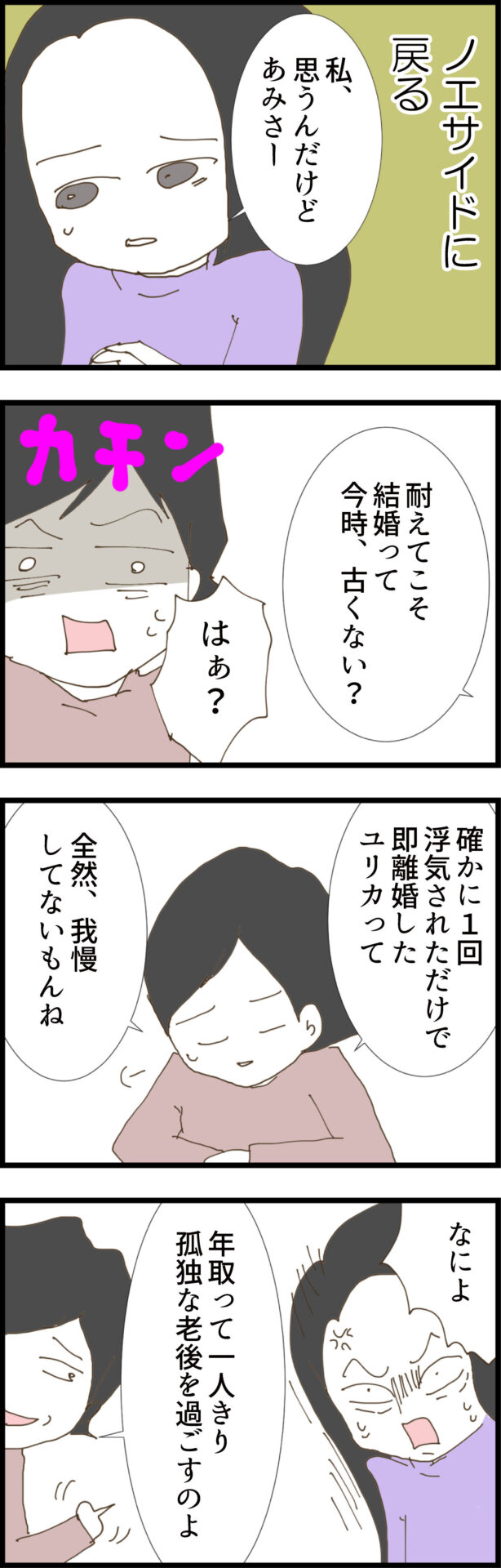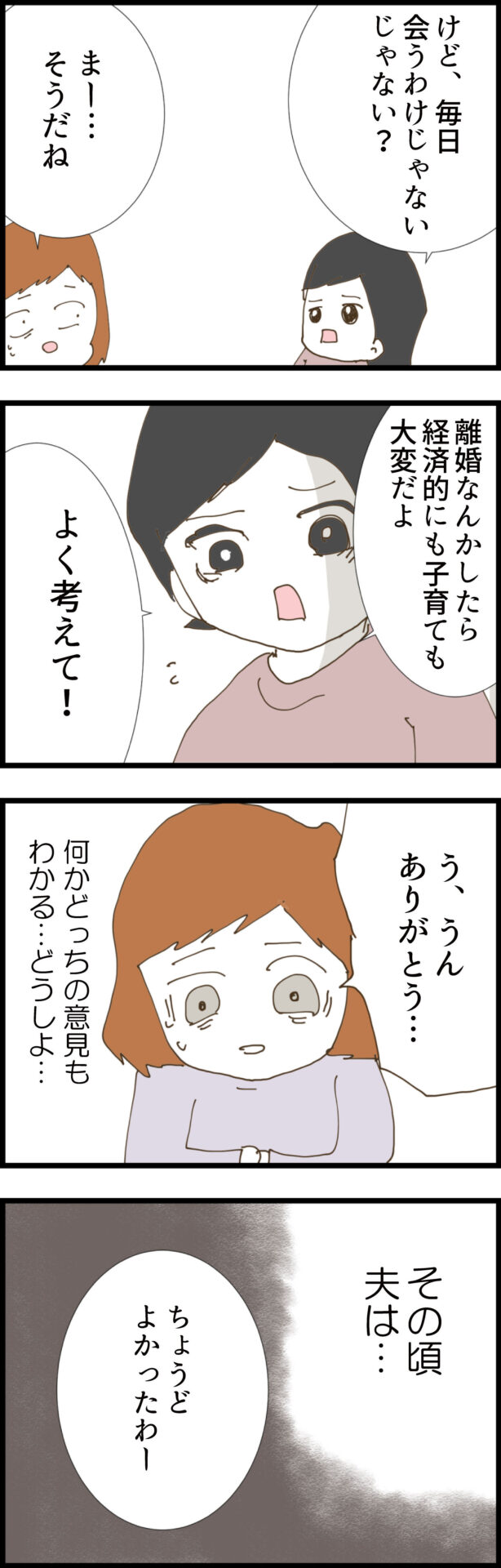 しかし、高校時代の友人・あみに相談すると「浮気や暴力がないのに?」「親や子供が悲しむ」と大反対されてしまう。