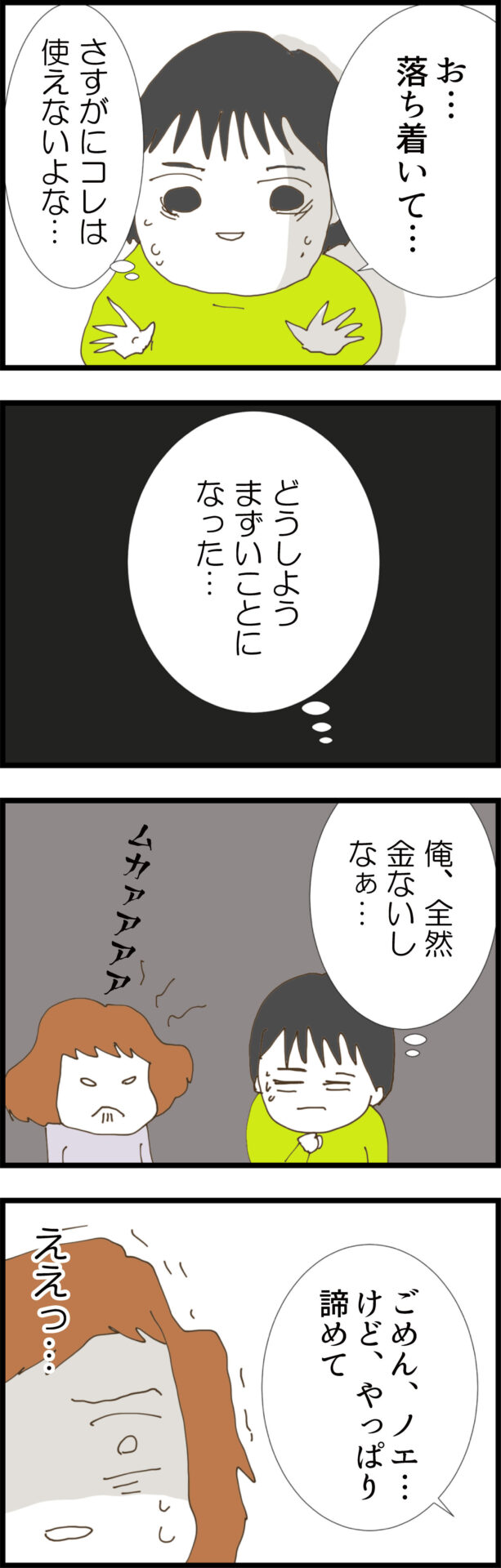「俺お金ないし…ノエの貯金で買ってくれ」と身勝手にも程がある夫に、ノエの堪忍袋の緒が完全に切れる。