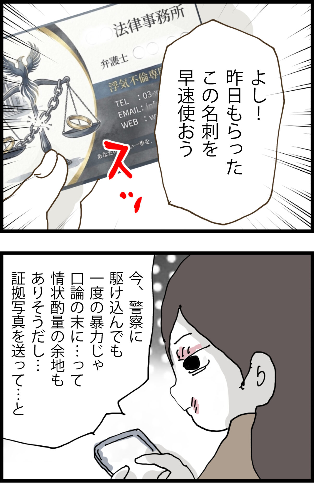 昨晩出会った弁護士に早速コンタクトを取るミツコ。暴行の証拠写真だけでなく、長年見て見ぬふりをしてきた「不倫の慰謝料」もしっかり請求する構え!