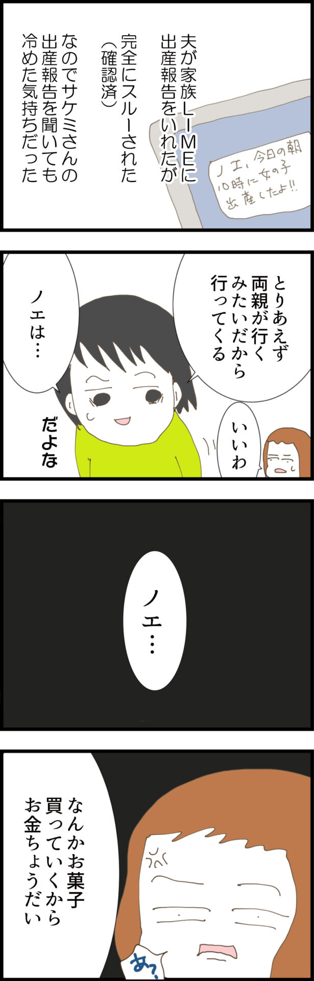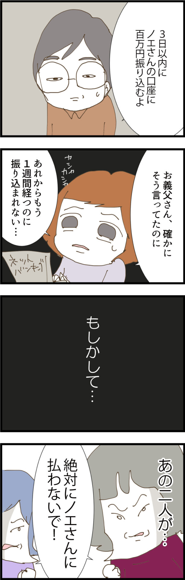 義父の「100万円を肩代わりする」という言葉を信じ、離婚を一旦保留にしたノエ。しかし帰宅途中の車内で、夫は反省するどころか「お母さんがかわいそう」と自分勝手な発言を繰り返す。さらに、約束の期限を過ぎても口座に100万円が振り込まれる気配はなく、義実家への不信感は決定的なものとなるが……。