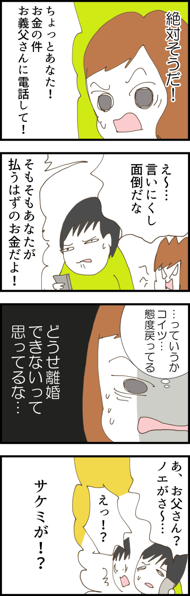一向に入金がないことに痺れを切らしたノエは、夫を問い詰め義父へ電話をかけさせる。