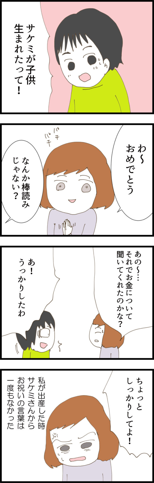 100万円の件はどこへやら、自分の時の仕打ちを棚に上げて「お祝い」を優先しようとする夫。
