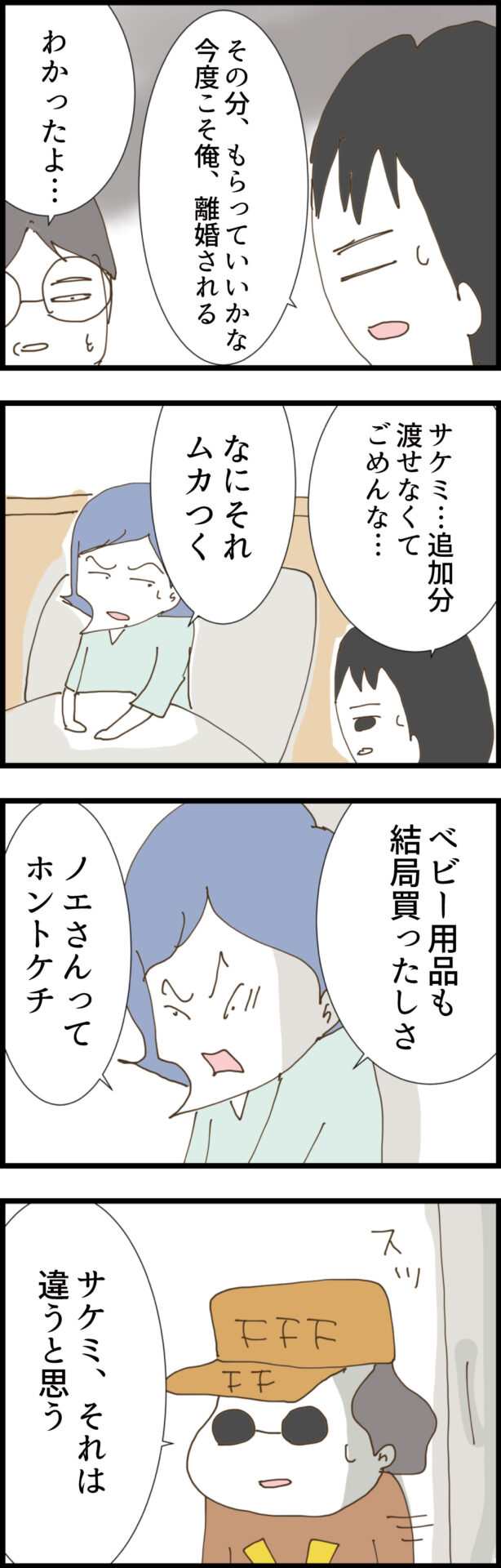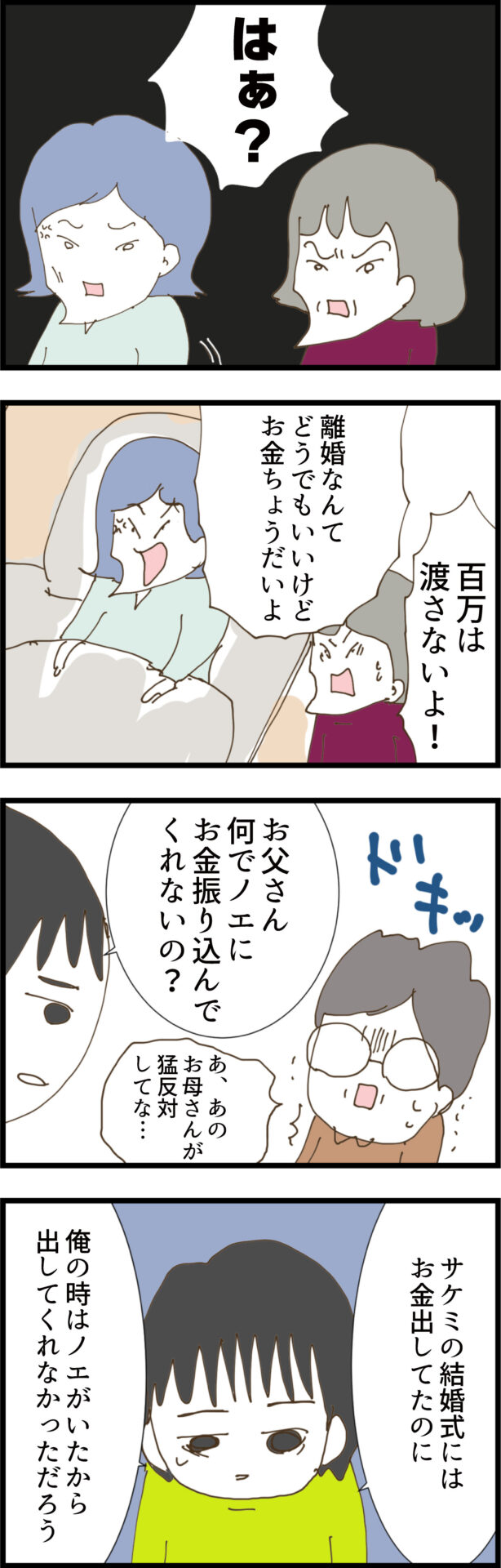 義妹サケミの病院へ向かった夫だったが、そこで待っていたのはサケミと義母からのノエに対する悪口と、離婚への後押しだった。さらにサケミから「追加の5万円」を要求された夫は、いつもなら義家族の言いなりになるところをキッパリと拒絶。「俺はノエと離婚したくない」と、ついに自分の意志を義母たちに告げるが……。