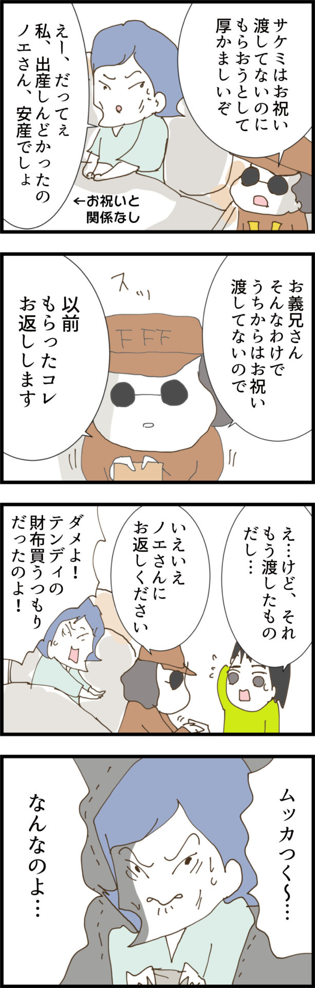 すると今度はサケミが「ノエさんってホントケチ」と嫌味を言い始めるが、図々しさを見かねた義弟(サケミの夫)がファインプレー!ノエが渡したお祝い金を無事に返還してくれることに。