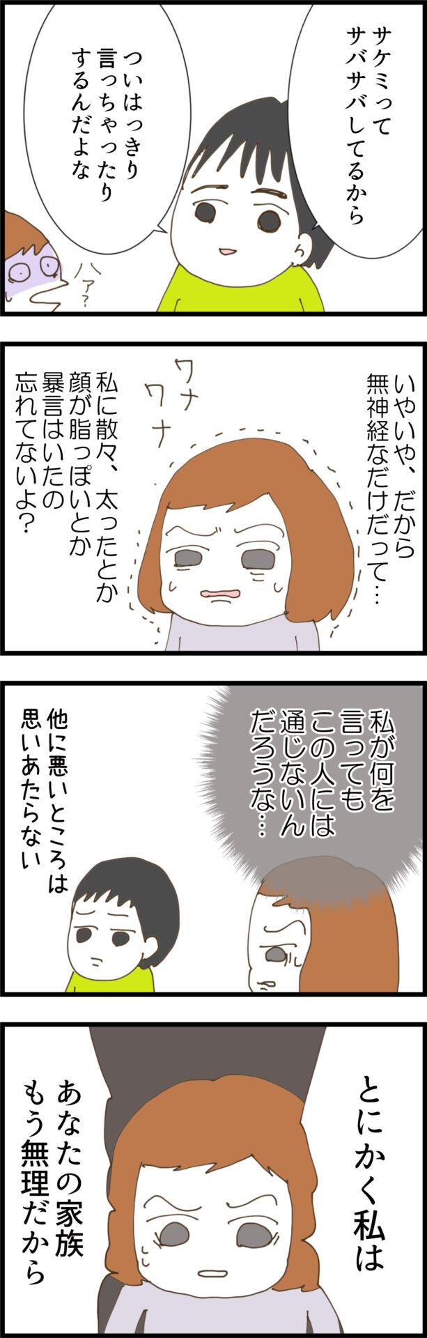 戻ってきたお祝い金で自分のダウンを買ってと要求する夫に対し、ノエはこれまで我慢していた義実家の厚かましさを指摘する。しかし夫は「次にお母さんと妹の悪口言ったらマジでキレる」と逆ギレ!あろうことか「サケミはみんなに可愛がられて好かれる性格で、お前と相性が悪いだけ」と身内を庇い正当化し続ける。