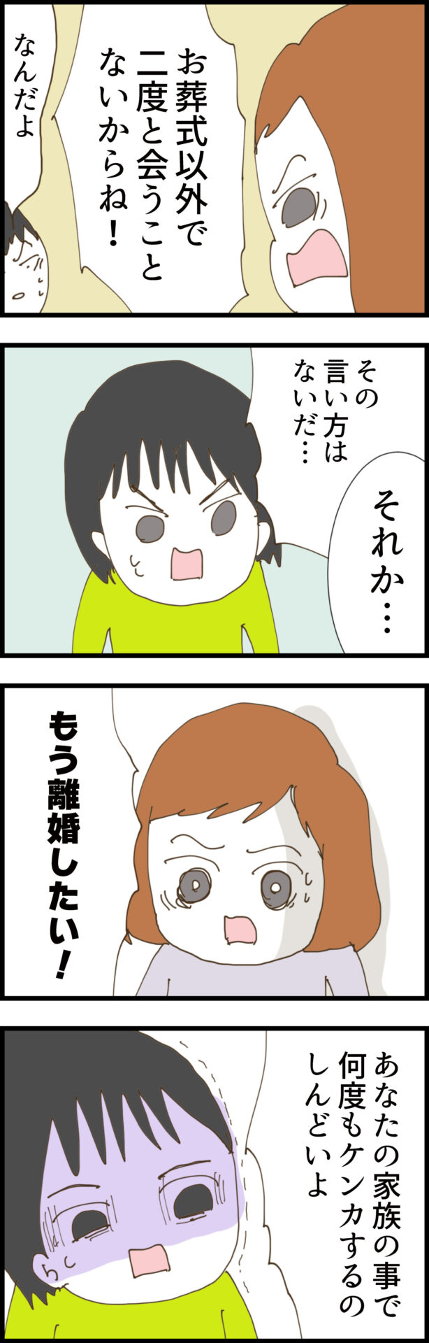 「サケミはサバサバしてるから」と暴言すらも擁護する夫に対し、ノエは「お葬式以外で二度と会うことないからね!」と絶縁を宣言し、ついに「もう離婚したい!」と涙ながらに限界を訴える。