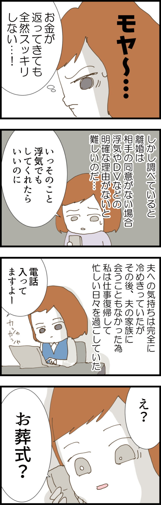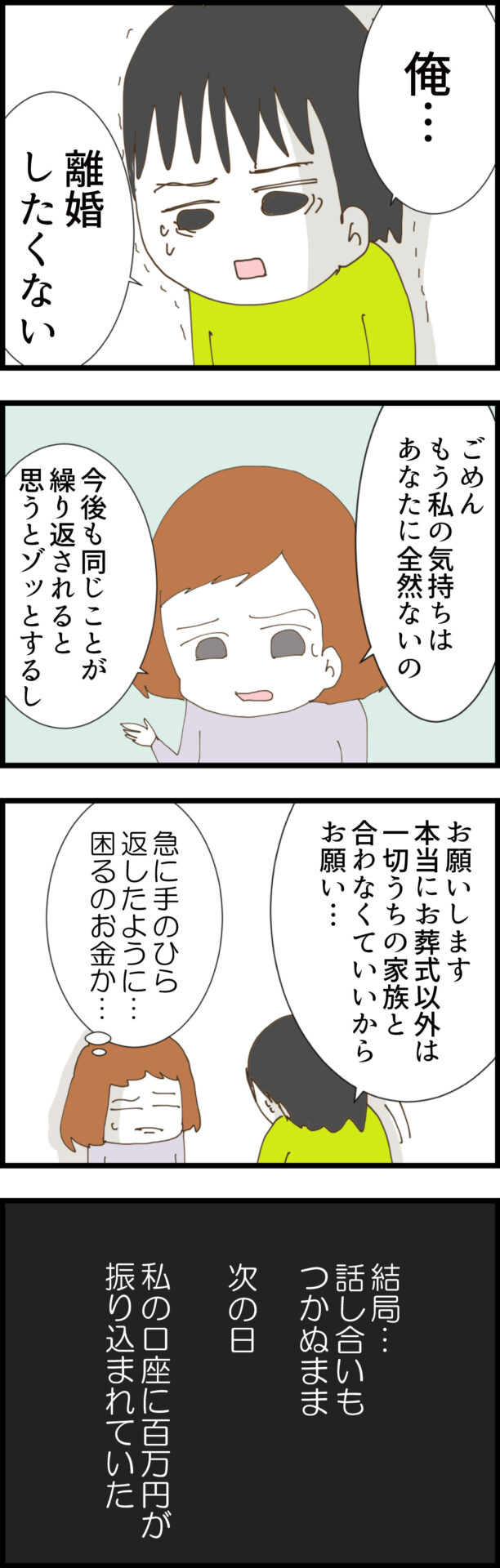 ノエの決意に焦った夫が「本当にお葬式以外は一切合わなくていいから」と懇願し、翌日には無事に100万円が振り込まれるが、ノエの気持ちは全く晴れない。