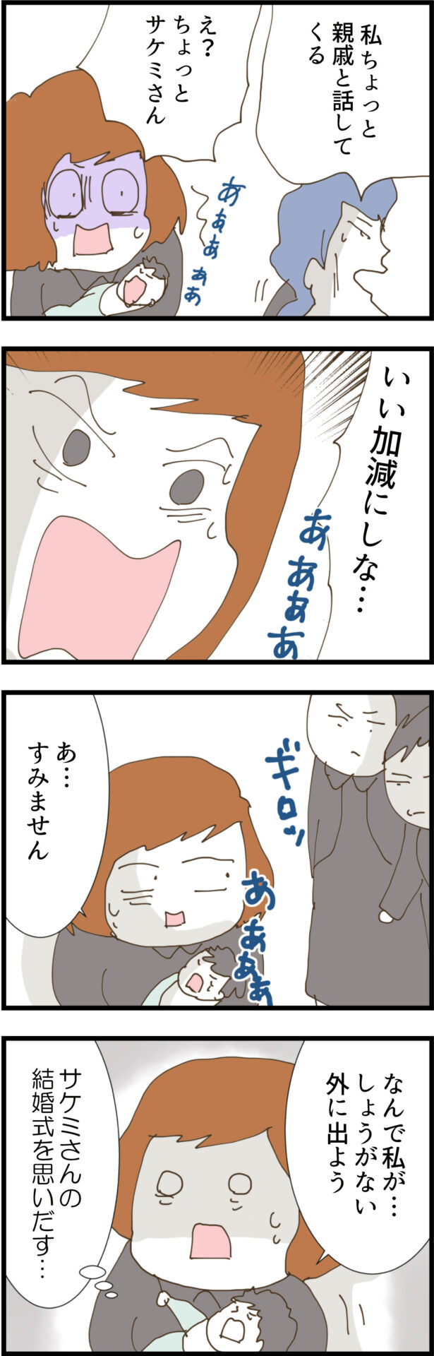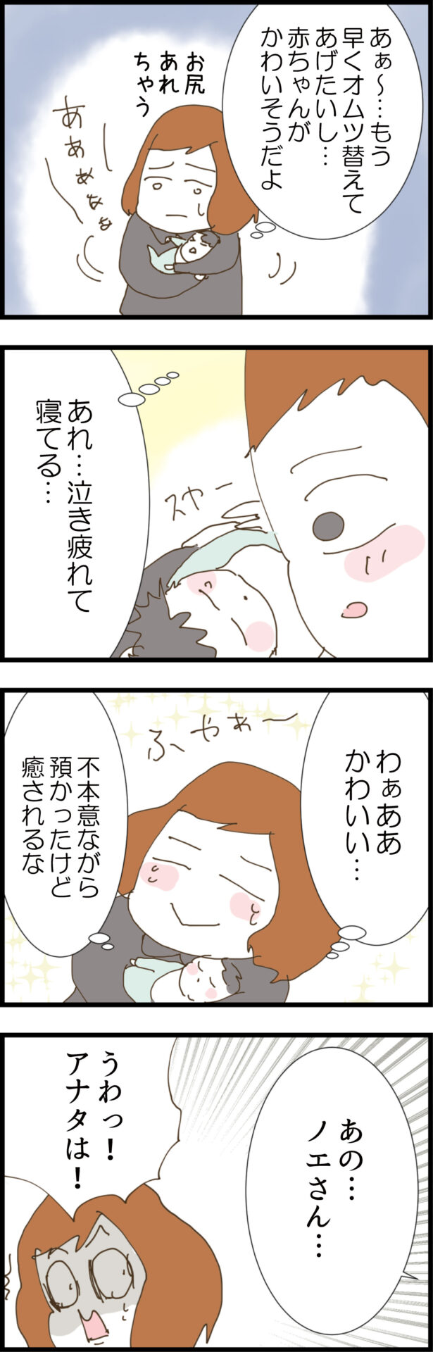 「親戚と話してくる」と逃げるサケミをギロリと睨みつけつつも、泣き疲れて眠った赤ちゃんに癒やされるノエ。