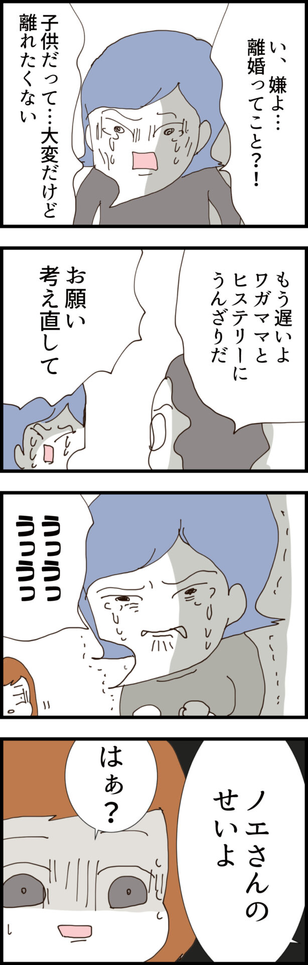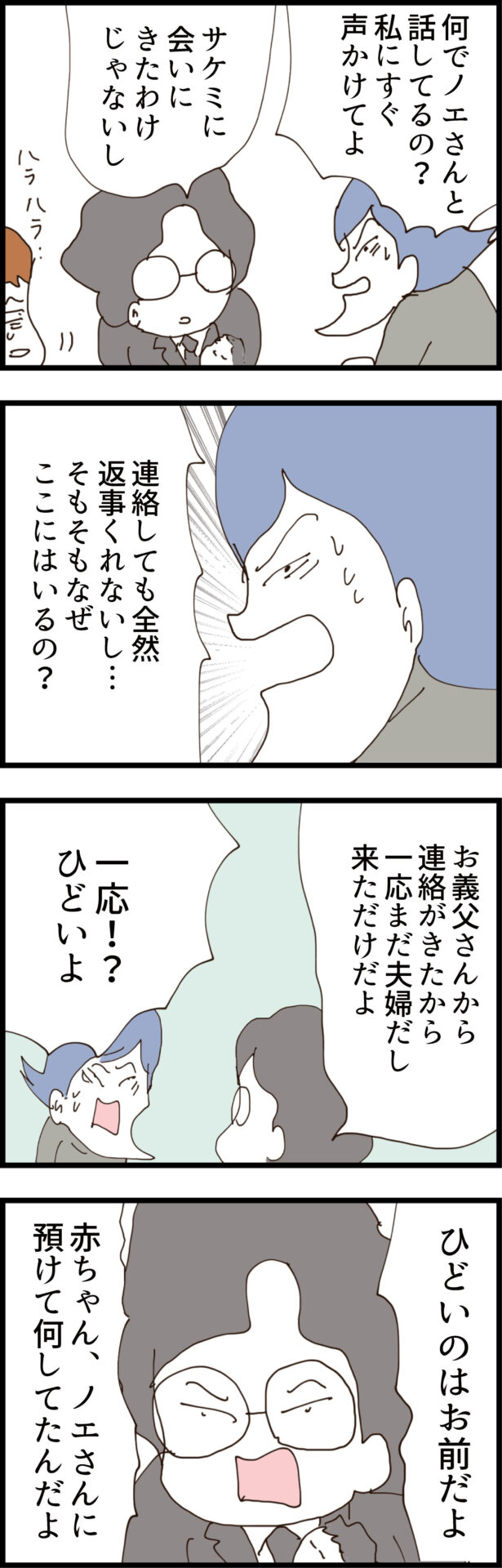 今の家の敷金礼金までノエの貯金から払っていたという事実が発覚する中、ついにサケミが乱入。「私からの連絡は無視するくせに何でノエと話してるの!」と夫にキレ始める。さらに、子供を押し付けていたことを咎められると「ワンオペで着替える間もなかったの!あなたのせいよ」とまたもや責任転嫁。