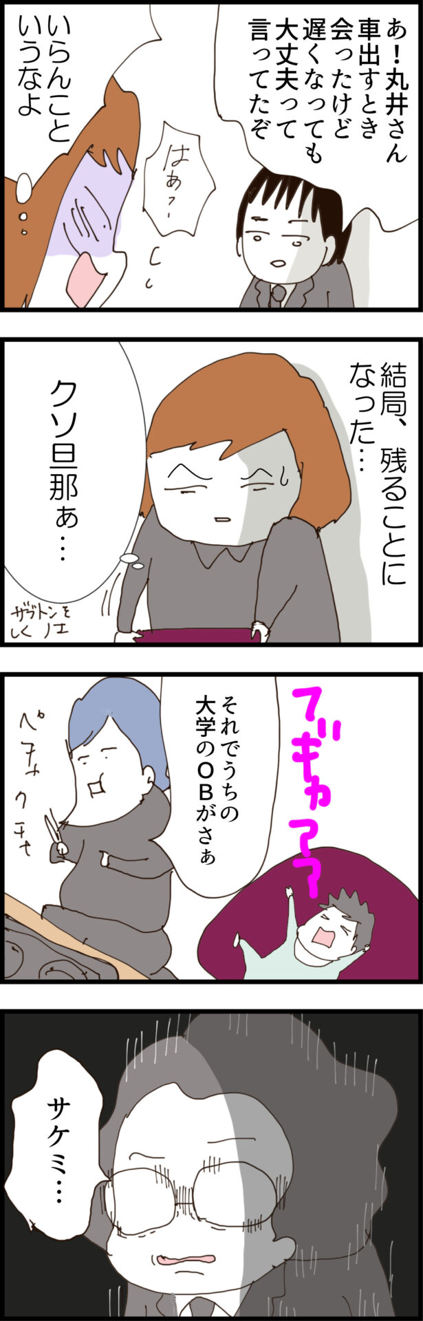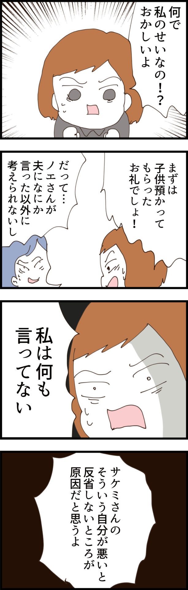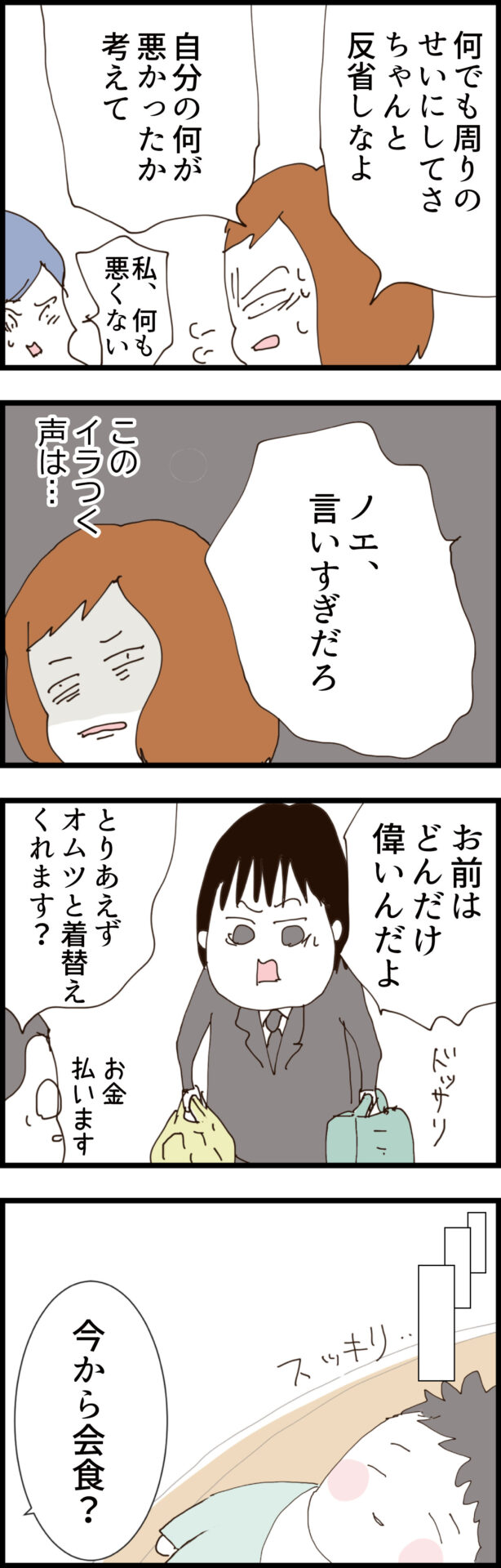 「自分が悪いと反省しないところが原因」とド正論で反撃するノエだが、サケミは「私、何も悪くない」と全く聞く耳を持たない。さらに通夜ぶるまいの席で、子供を理由に帰ろうとするノエに対し、夫が「遅くなっても大丈夫って言ってたぞ」と余計な口出しをして帰路を絶つ。