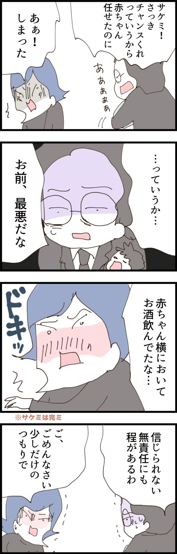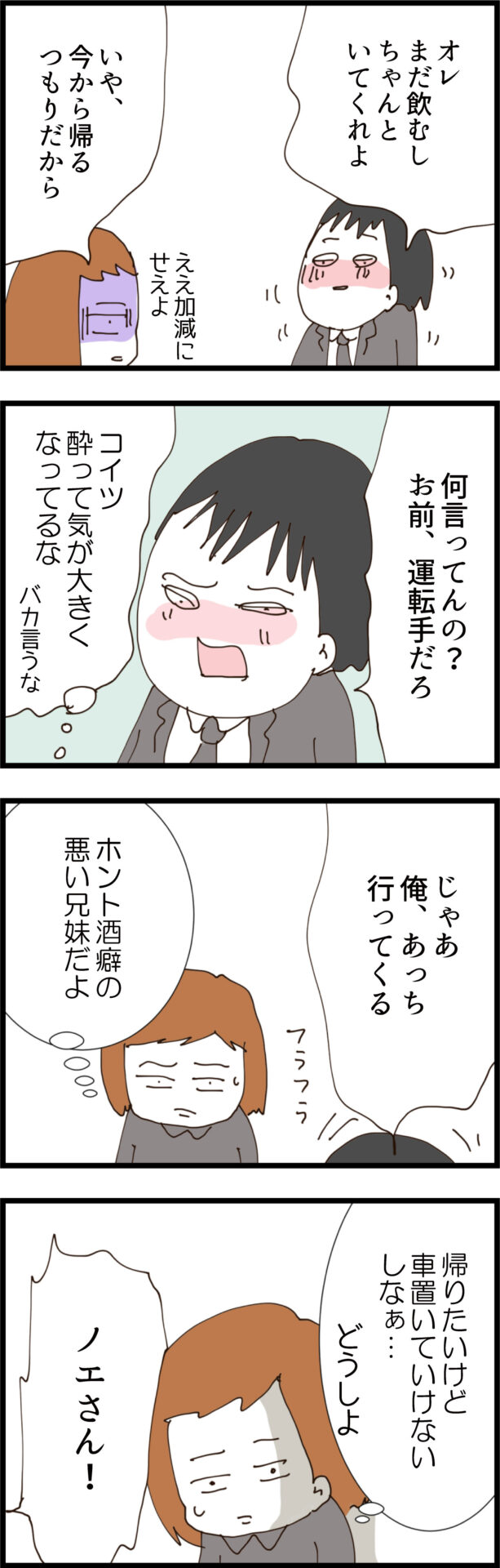 赤ちゃんの横で酒を飲み、義弟に激怒されるサケミ。その隙に帰ろうとするノエだが、夫に「お前、運転手だろ」と足止めされる。