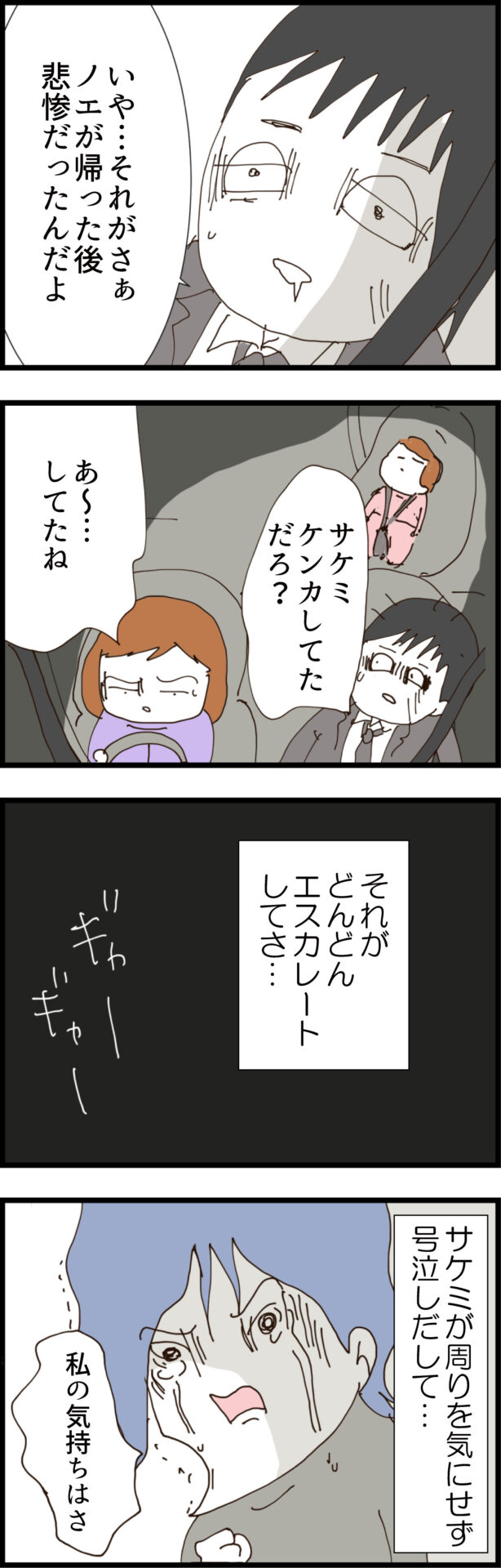 駅の階段から落ちて足をくじいたと言い訳する夫は、ノエが帰った後の惨劇を語り出す。サケミは「離婚したくない」と号泣するも、「お酒飲むと楽になるから」と最低な言い訳をして義弟にドン引きされていた。