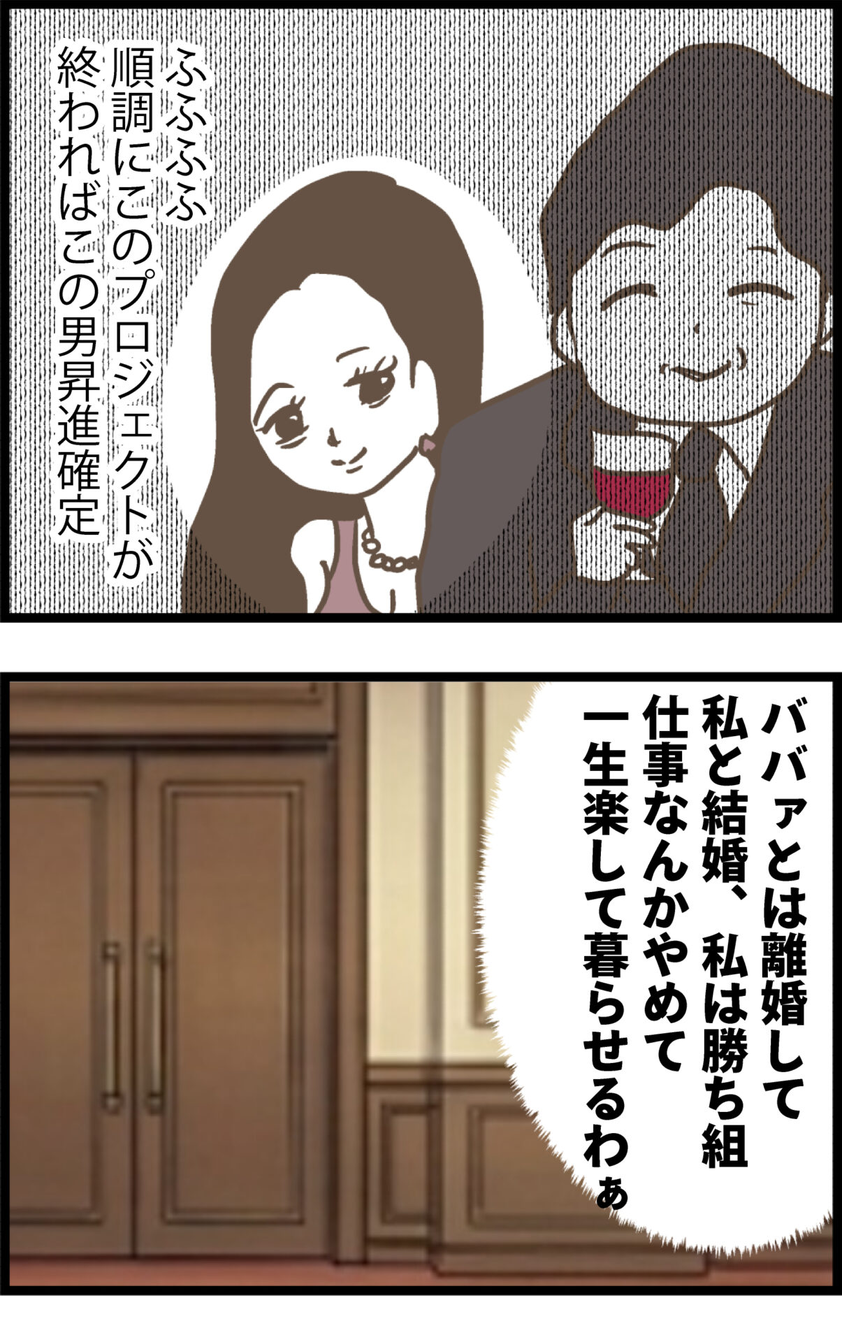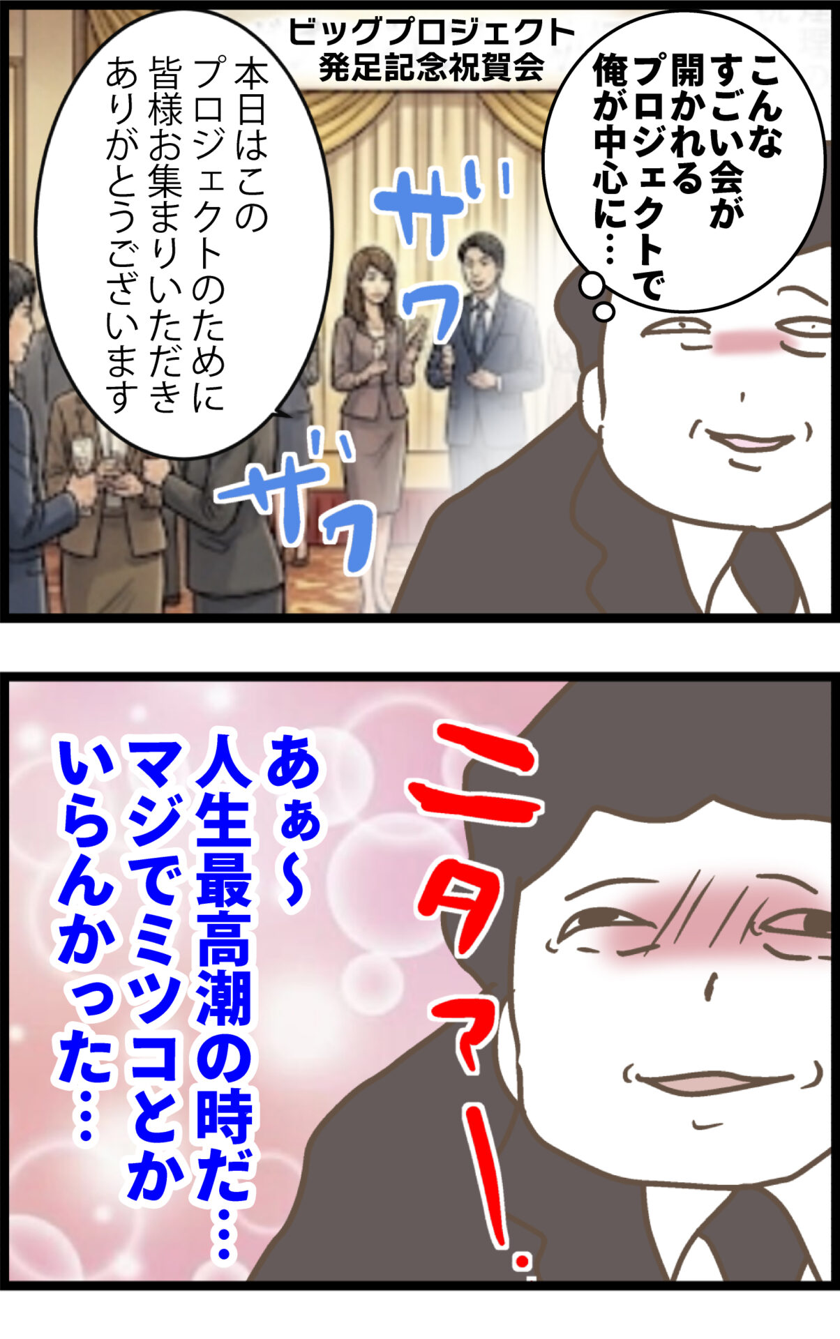 ビッグプロジェクトの発足記念祝賀会が開かれ、「人生最高潮」と完全に浮かれ切るまさし。愛人もまさしの昇進と略奪婚を確信し、勝ち誇っていた。