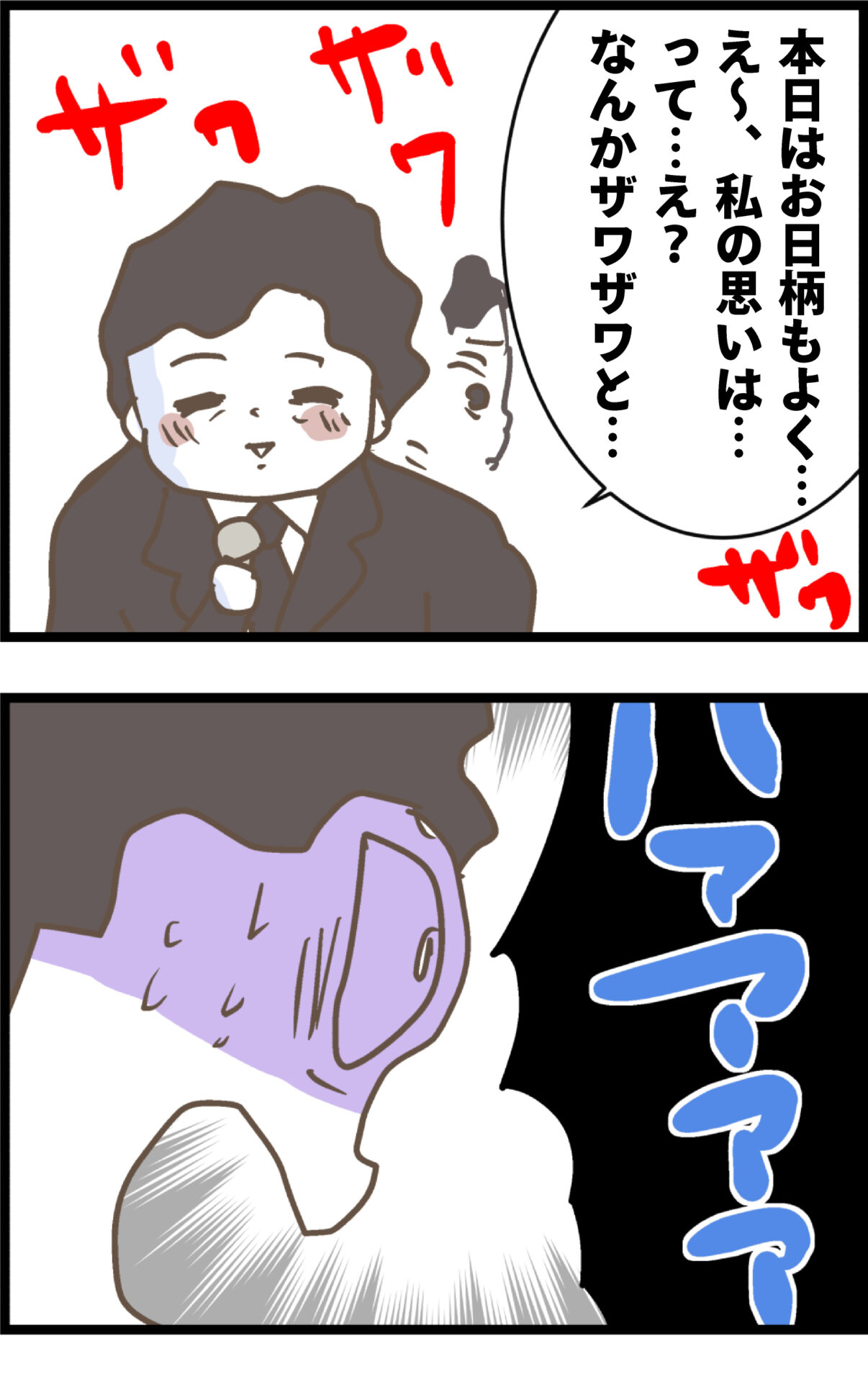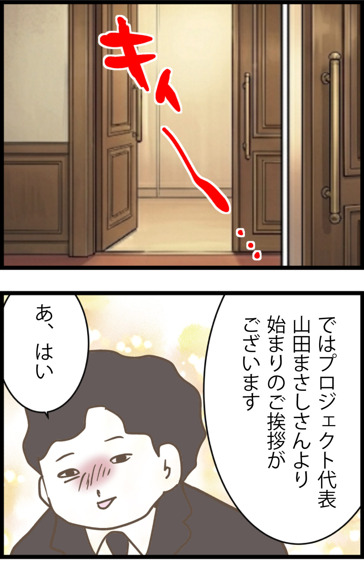 しかし、まさしの代表挨拶の最中、会場の扉が開き空気が一変。ざわめく出席者たちと、顔面蒼白で冷や汗を流すまさし。