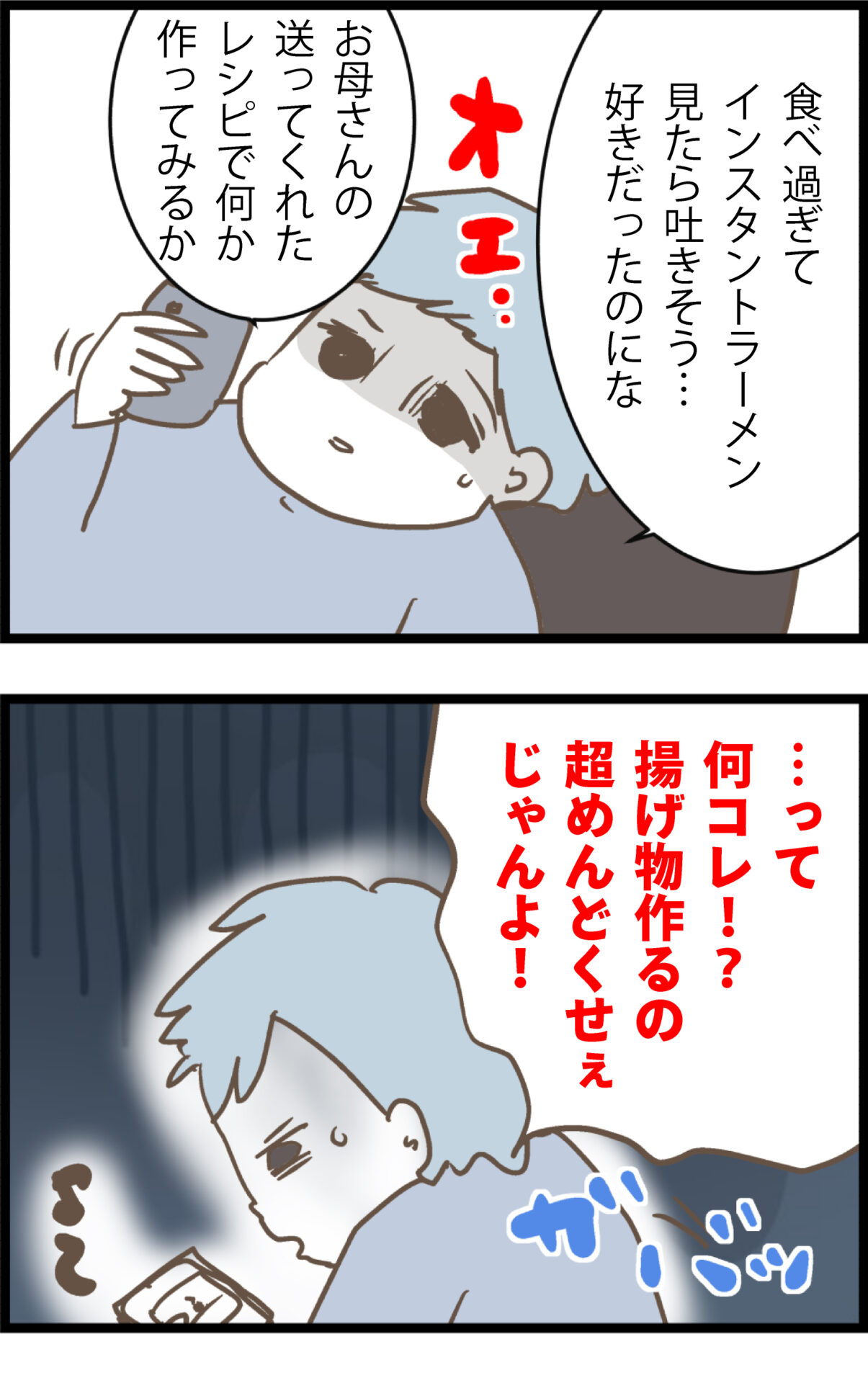 母親のレシピを見て料理に挑戦しようとする息子。揚げ物の手間に直面し、文句を言いながらも出来立てを用意してくれていた母親の愛情にようやく気づく。