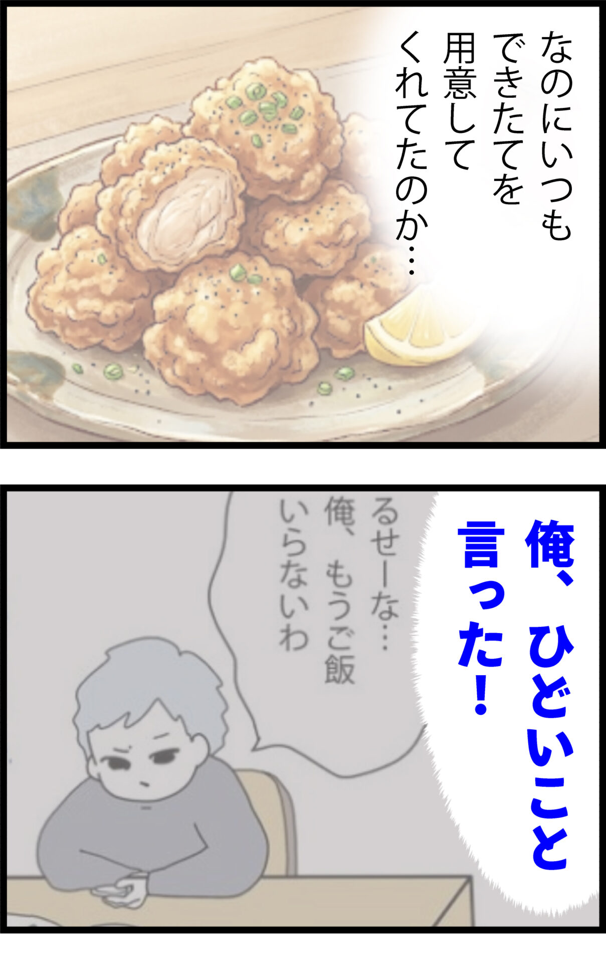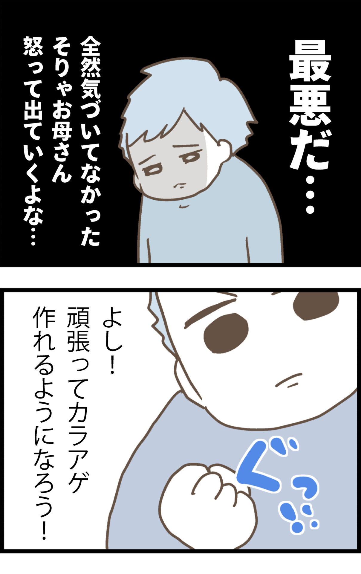 過去の暴言を深く反省した息子は、いつか母親に食べてもらうためにカラアゲ作りの特訓を決意した。