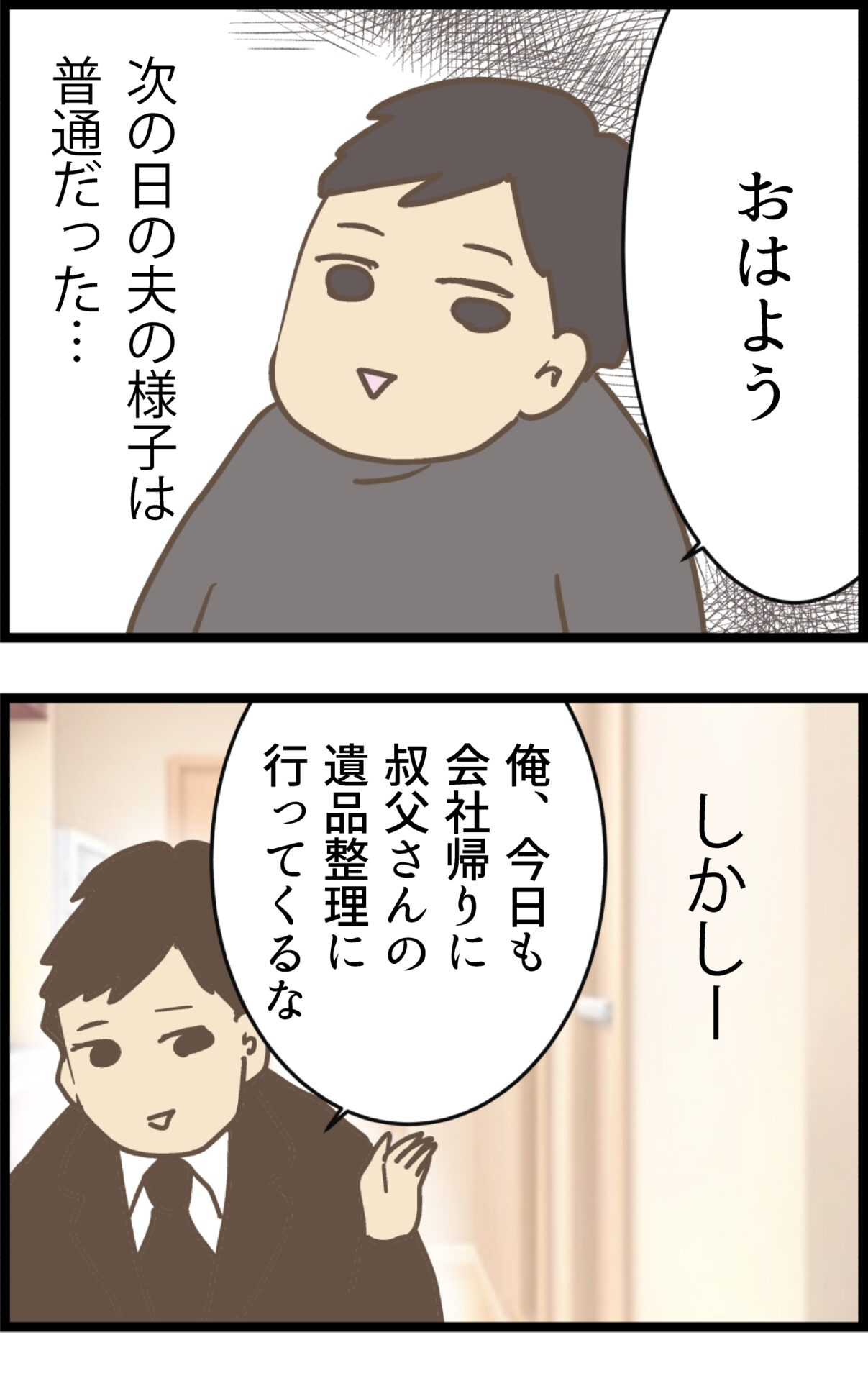 義叔父が亡くなり、その遺品整理を理由に毎日のように会社帰りに義叔父の家へと通い続ける夫。表向きは普段通りに振る舞っているものの、妻はその頻度と不自然な様子から「単なる遺品整理ではなく、何か別の目的があるのではないか」という強い疑念を抱くようになっていた。夫と義叔父の間には、妻の知らないどんな関係があったのか?