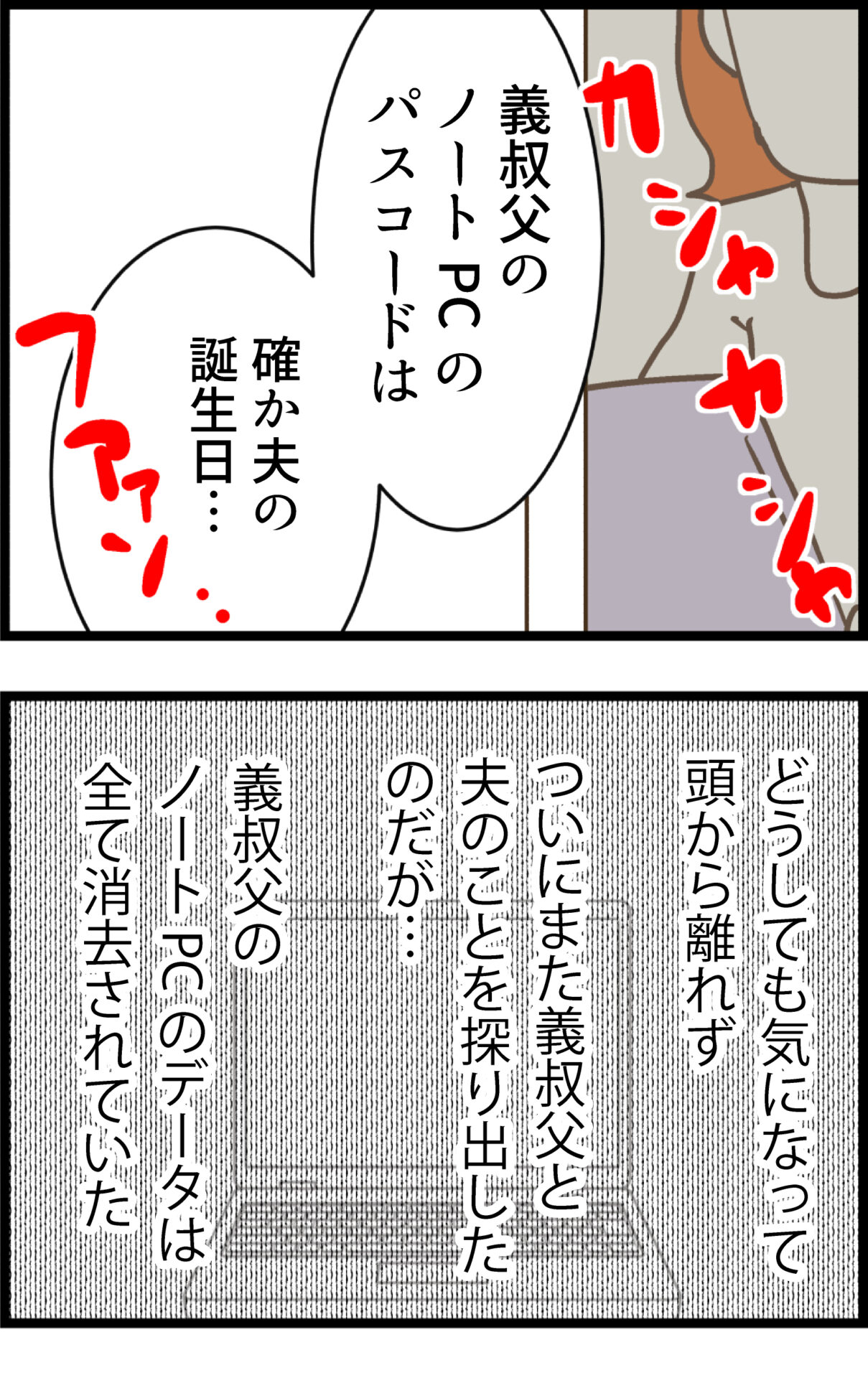 義叔父のノートPCのパスコードが「夫の誕生日」だったこと、そして中のデータが意図的に『全て消去されていた』という不気味な事実は、妻の頭から離れなかった。