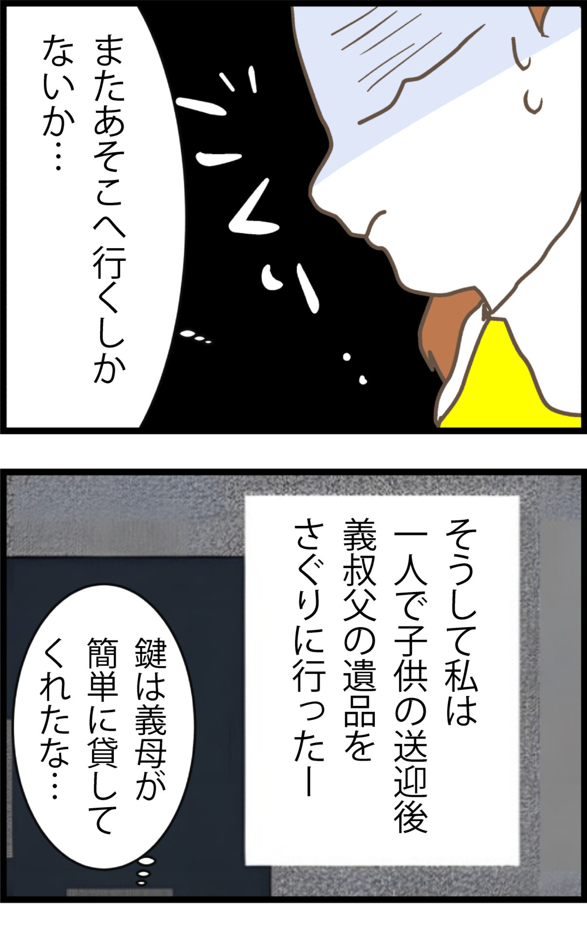 どうしても真実が知りたい彼女は、義母からあっさりと借りられた鍵を手に、子供の送迎を終えたその足で一人、義叔父の家へと向かう。