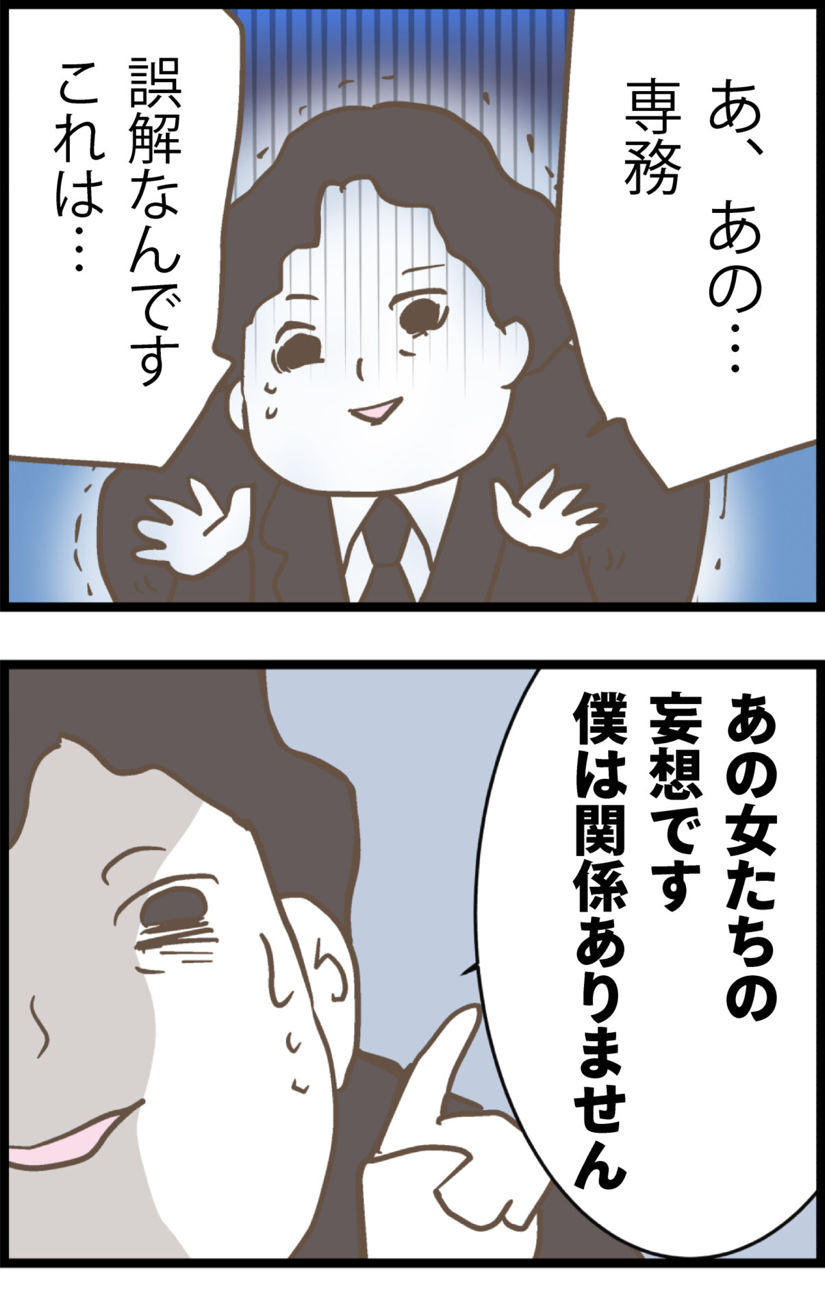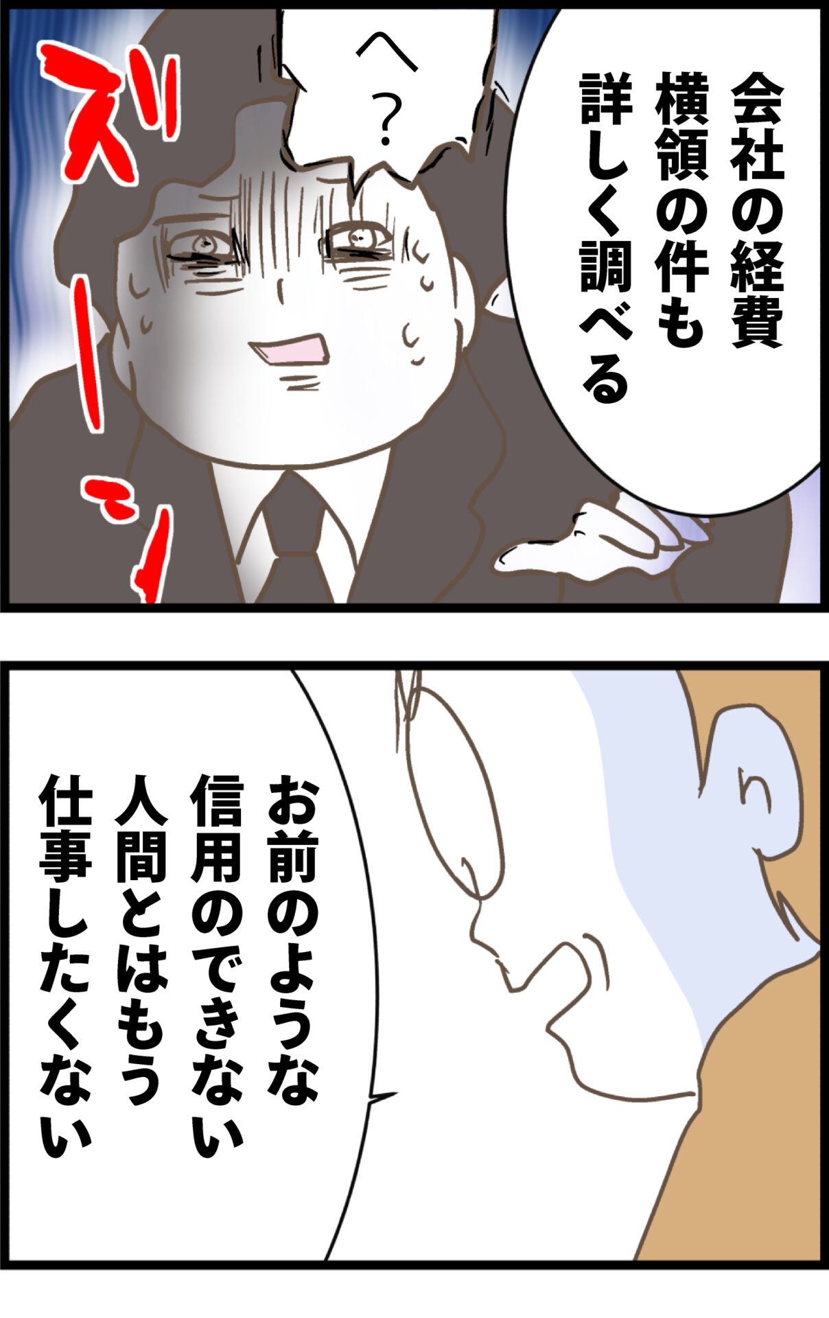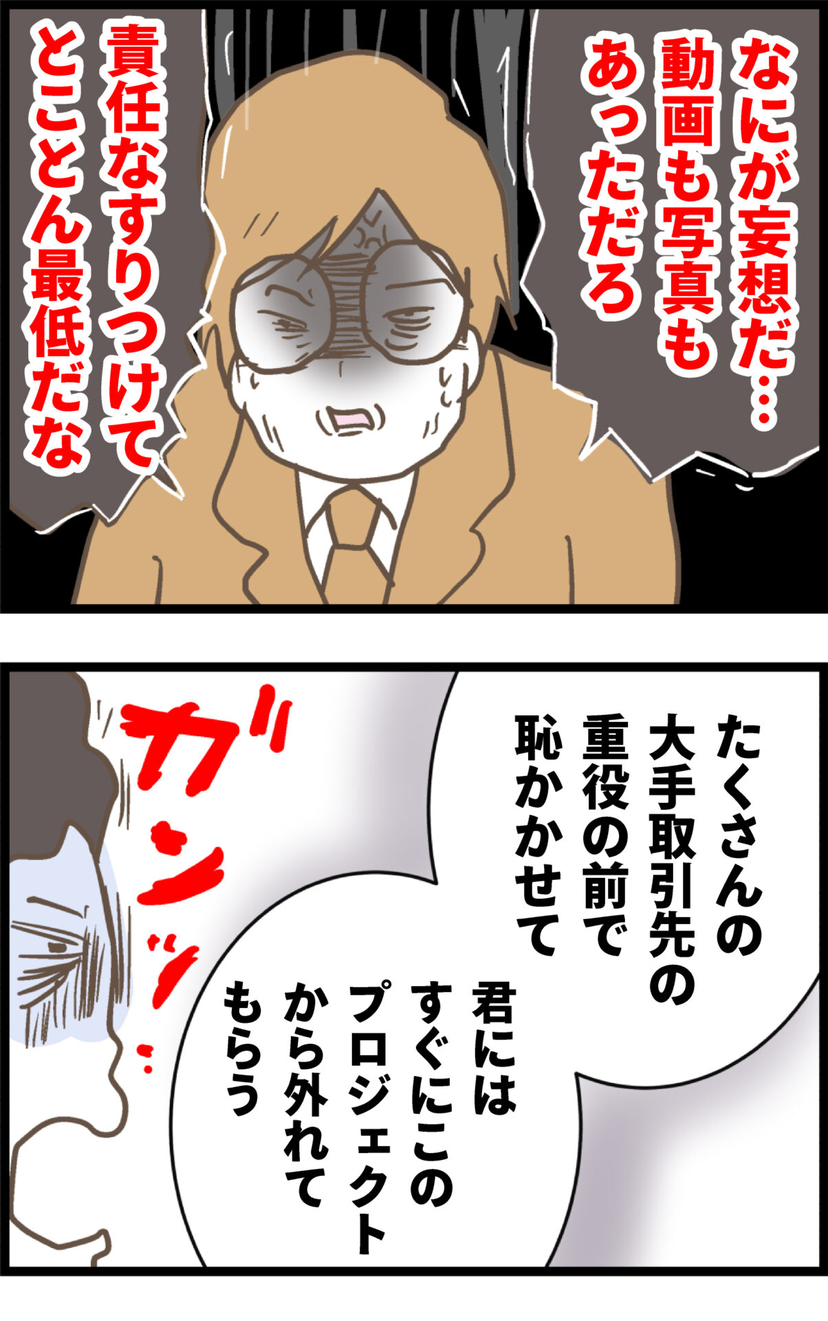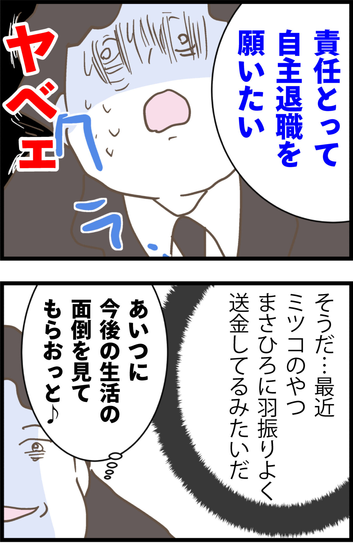 「女たちの妄想」と最後まで見苦しい言い訳を並べるまさしに対し、専務の怒りが爆発。プロジェクト解任と経費横領の調査、さらには事実上のクビである自主退職まで突きつけられる。