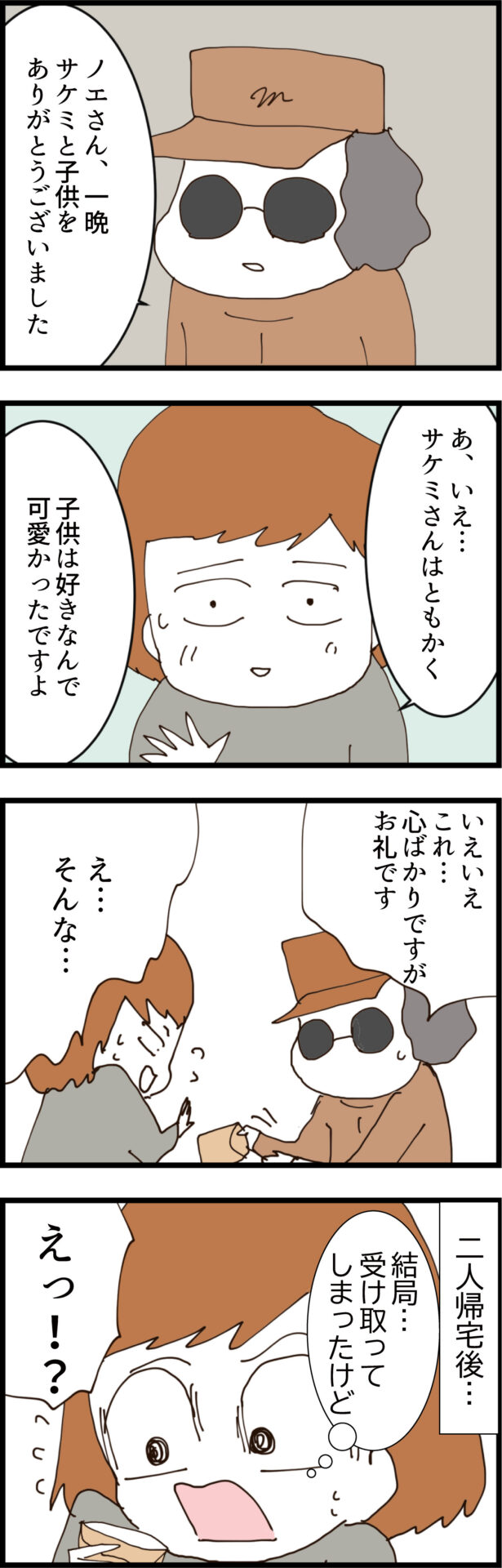 逃げたサケミも完全に自業自得やけど、放置する旦那もだいぶ冷酷やな!てか最後にノエがもらった封筒の中身、一体何なん!?まさかとんでもない額が入ってるとか!?次回が気になりすぎるわ!