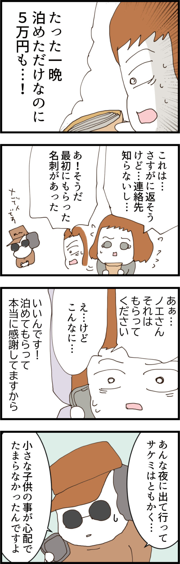封筒の中身はなんと5万円!驚いて返そうとするノエに、義弟は深い感謝を伝え、日が暮れるまでにサケミたちを探し出すと告げる。