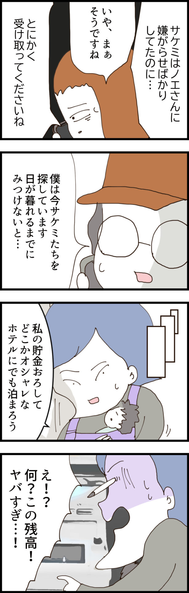 一方、ホテルに泊まろうとしたサケミはATMの残高を見て絶望。見栄を張って着もしないブランド服をカードで買ったことを思い出し、自分こそがバカだったと気づく。