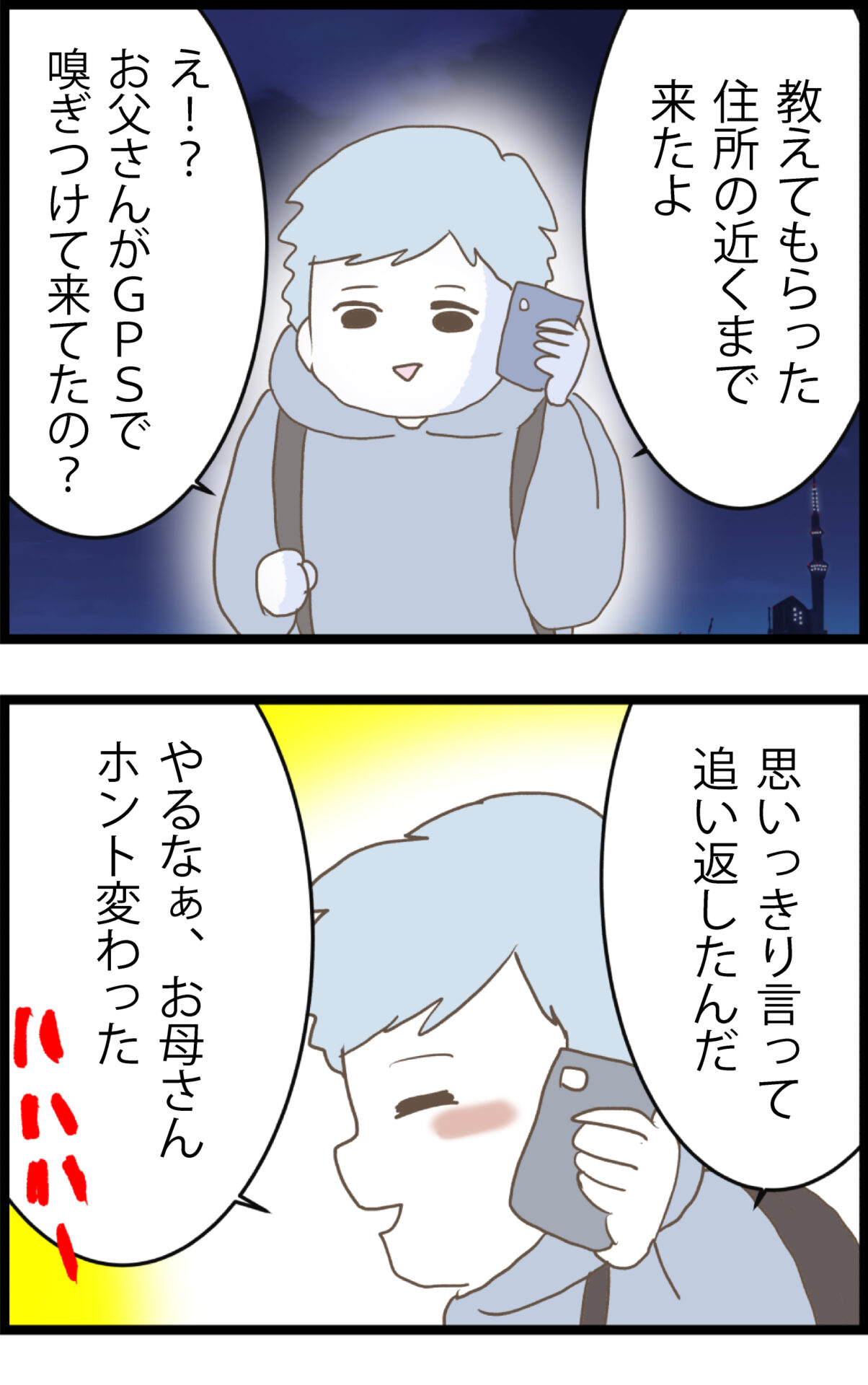 「俺のおかげで生きて来れた」とドア越しにわめき散らすまさしに対し、ミツコは「お金も稼げる私にお前なんて全く必要ない」と冷徹に言い放ち、警察を呼ぶフリで見事に撃退する。一方、息子のまさひろはミツコへ電話をかけていた。