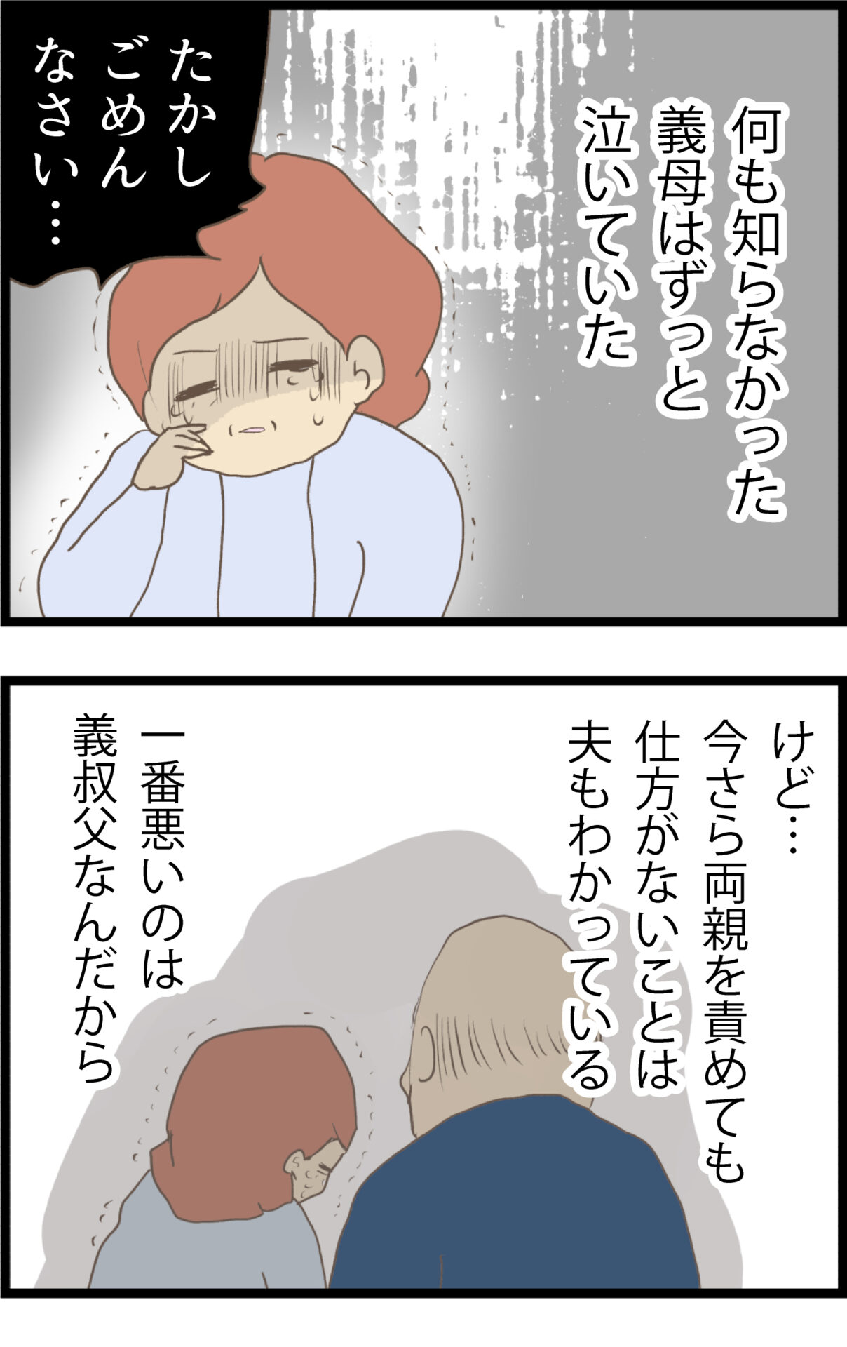 義父が義叔父を死に追いやった動機は、息子を守るためではなく、弟への劣等感と自身の保身という身勝手なものだった。立証は難しいものの、罪滅ぼしとして実家を売り、全額を慰謝料として渡すという義父母。泣き崩れる義母からの「全て忘れて幸せになって」という言葉で、長きにわたる因縁に一つの決着がついたかに思えたが……。