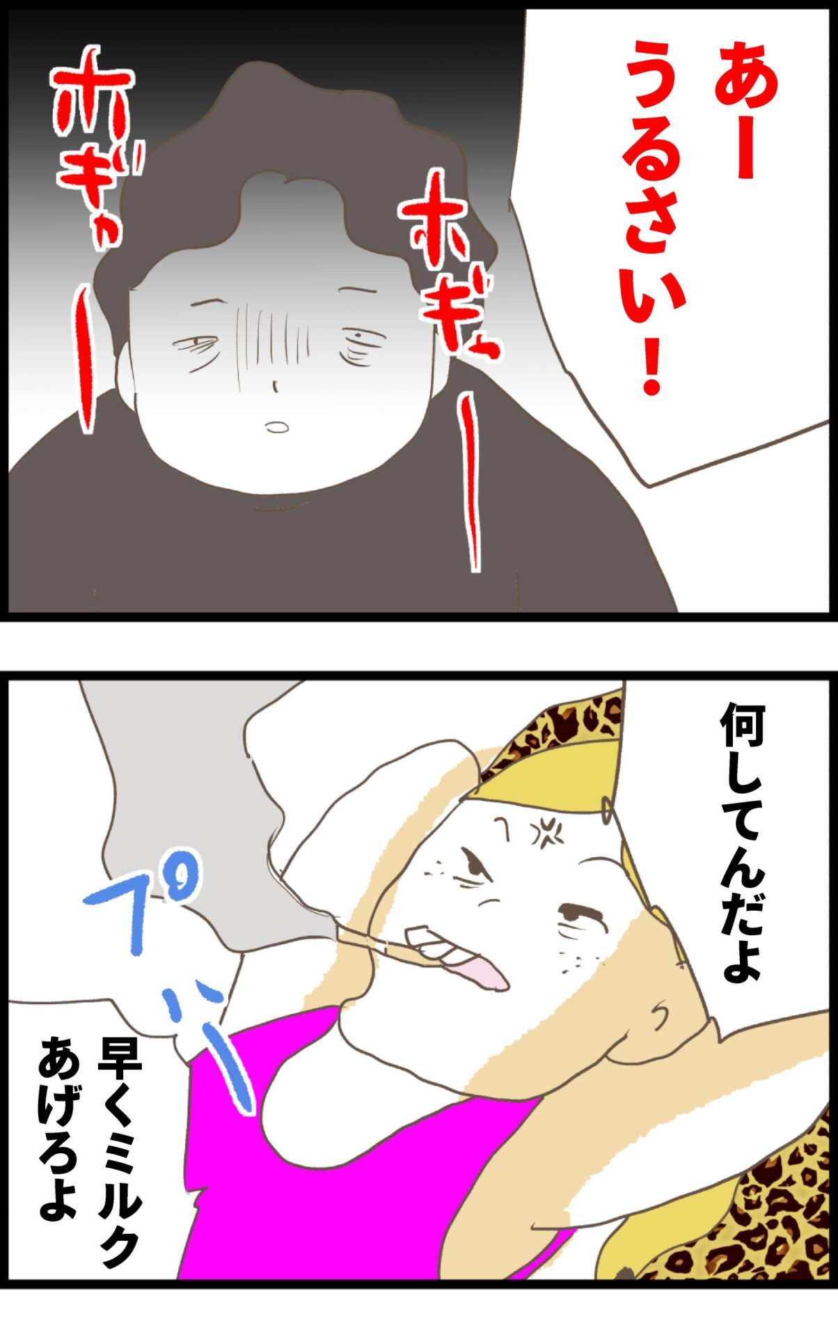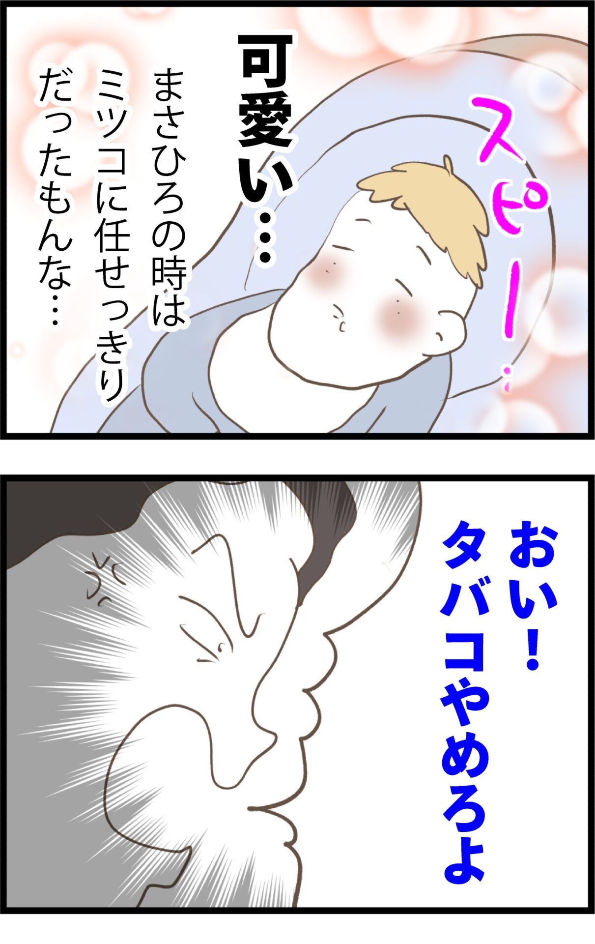 赤ん坊の寝顔を見てかつての子育てを反省するまさしだったが、直後に顔色を変えて怒鳴り声を上げた。