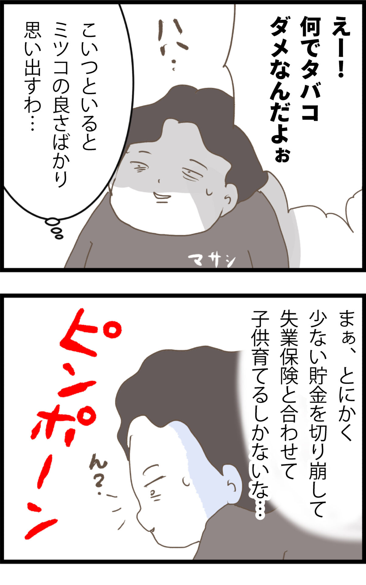 赤ん坊の世話をするまさしの元に、突然母親が金をせびりにやってくる。千円札を渡し、ミツコといた日々の幸せを思い出し激しく後悔するまさし。