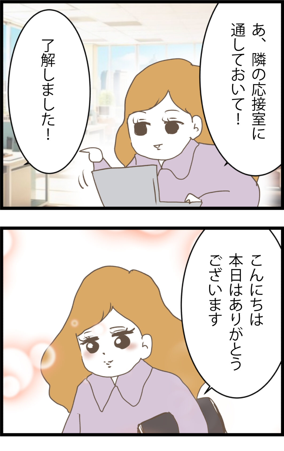 笑顔で挨拶するミツコ。面接に訪れた人物とは一体誰なのか。