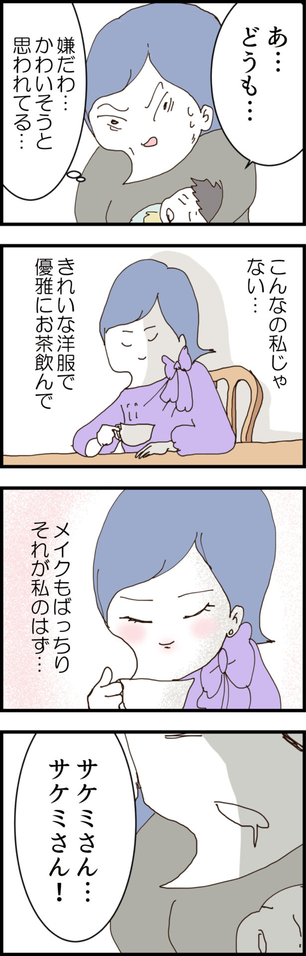 婚約者を連れた幸せ絶頂のカワイに対し、サケミは心の中で全力の悪態をつく。しかしカワイから思いがけず旦那の目撃情報が飛び出し、サケミは驚愕する。