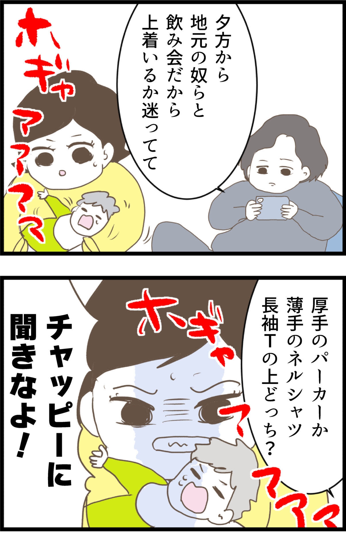 泣き叫ぶ我が子に見向きもせず、自分の飲み会の服装を相談してくるえいじ。