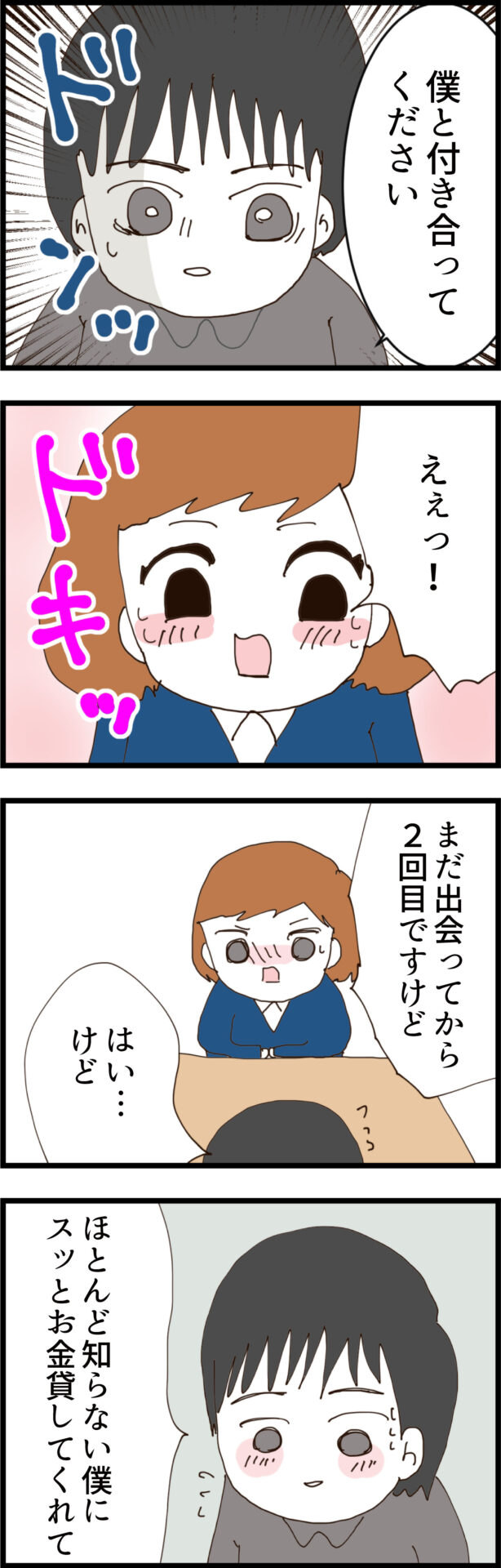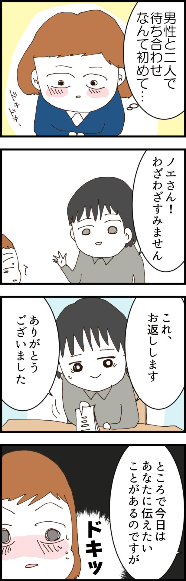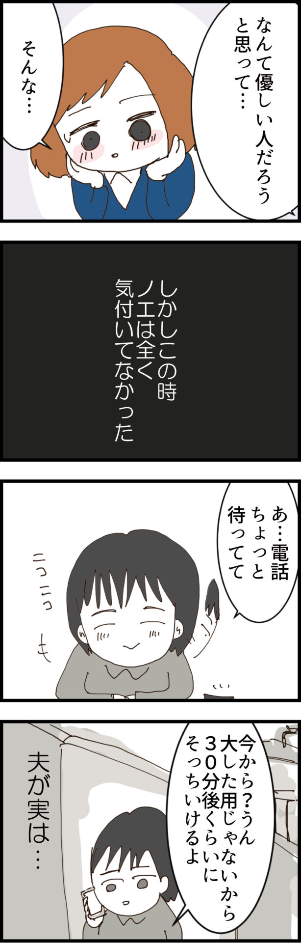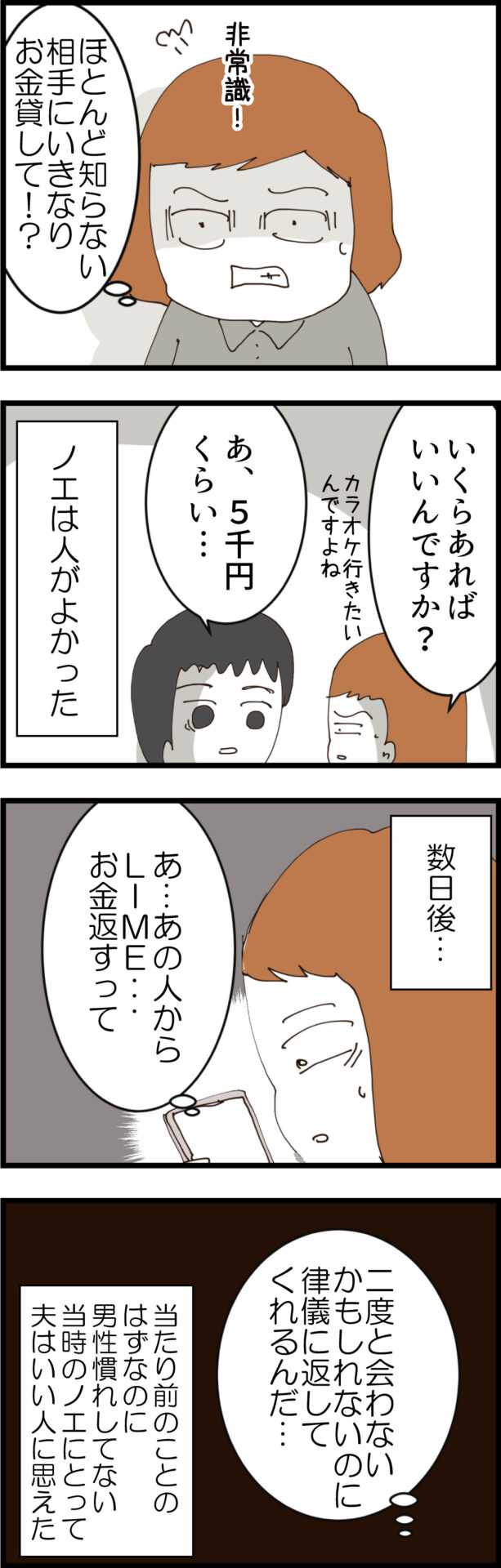 「前はもっと優しかった」と身勝手な言葉で侮辱してくる夫に対し、ノエはついに「私が変わったのは全部お前のせいだ!」と怒りを爆発させる。そして記憶は、二人が初めて出会った合コンの日へと遡る。他の女性に夢中でノエを放置していた夫だったが、帰り際に突然「カラオケに行く金がなくなったから貸してくれないか」と、初対面にもかかわらず信じがたい無心をしてきたのだった。