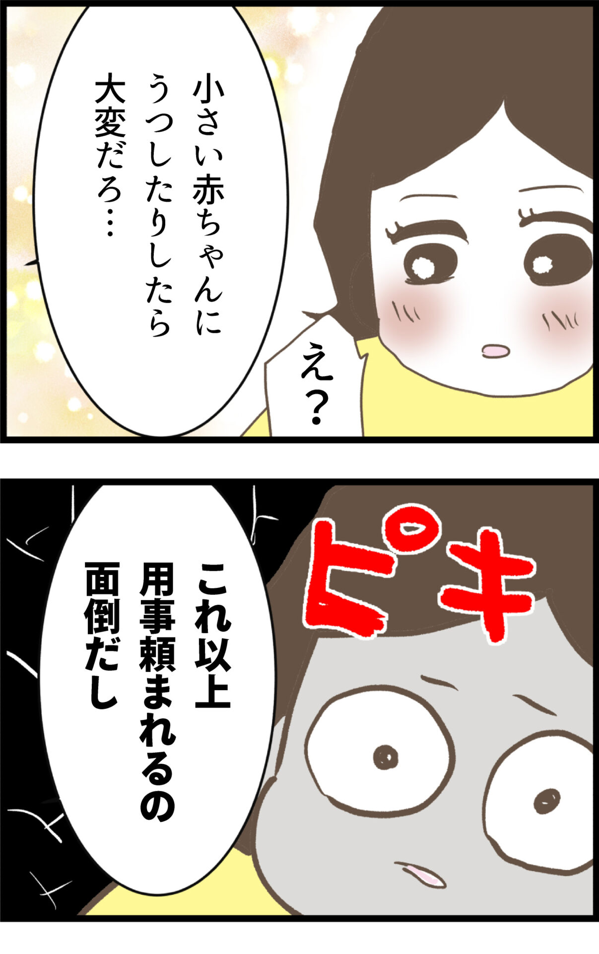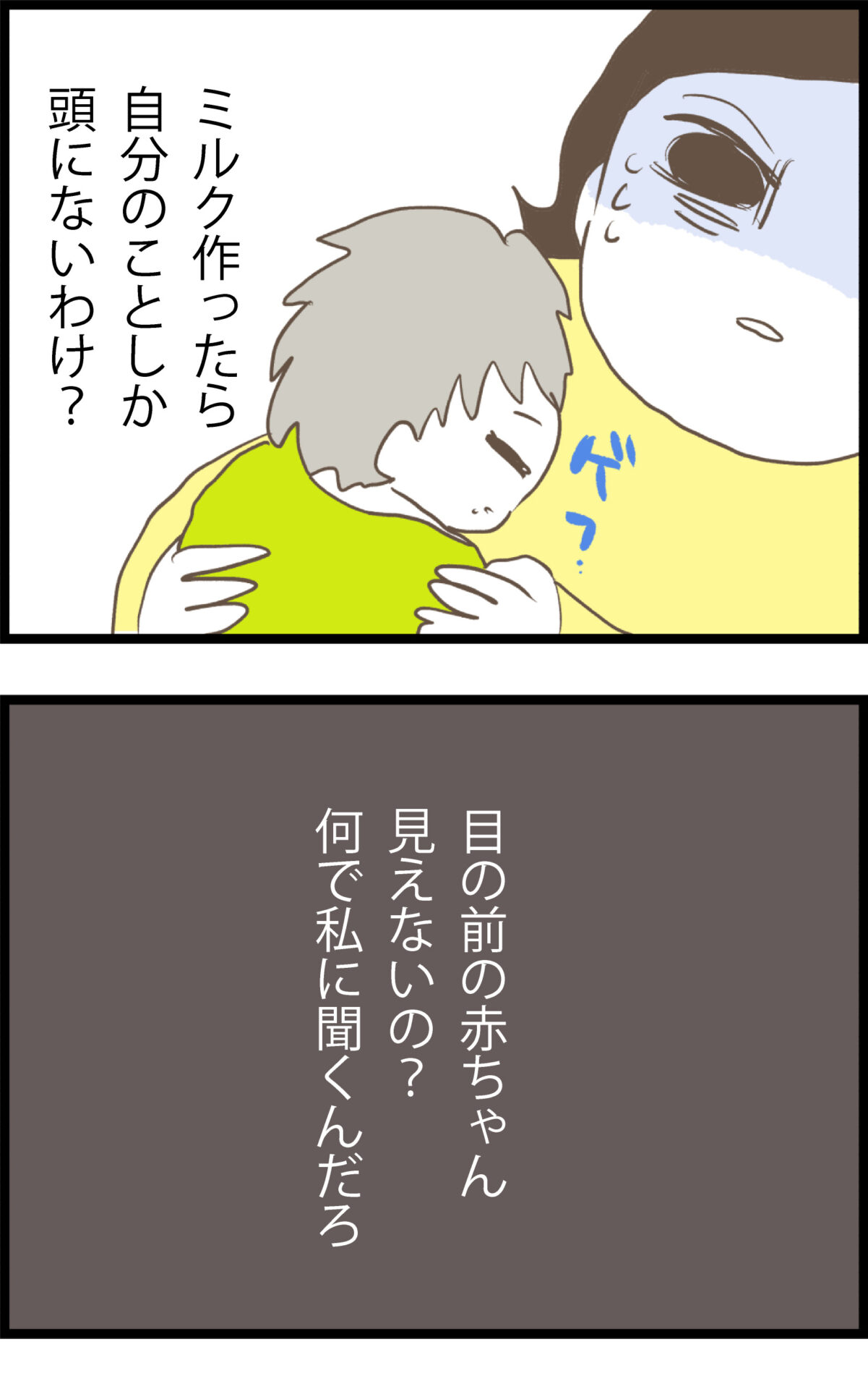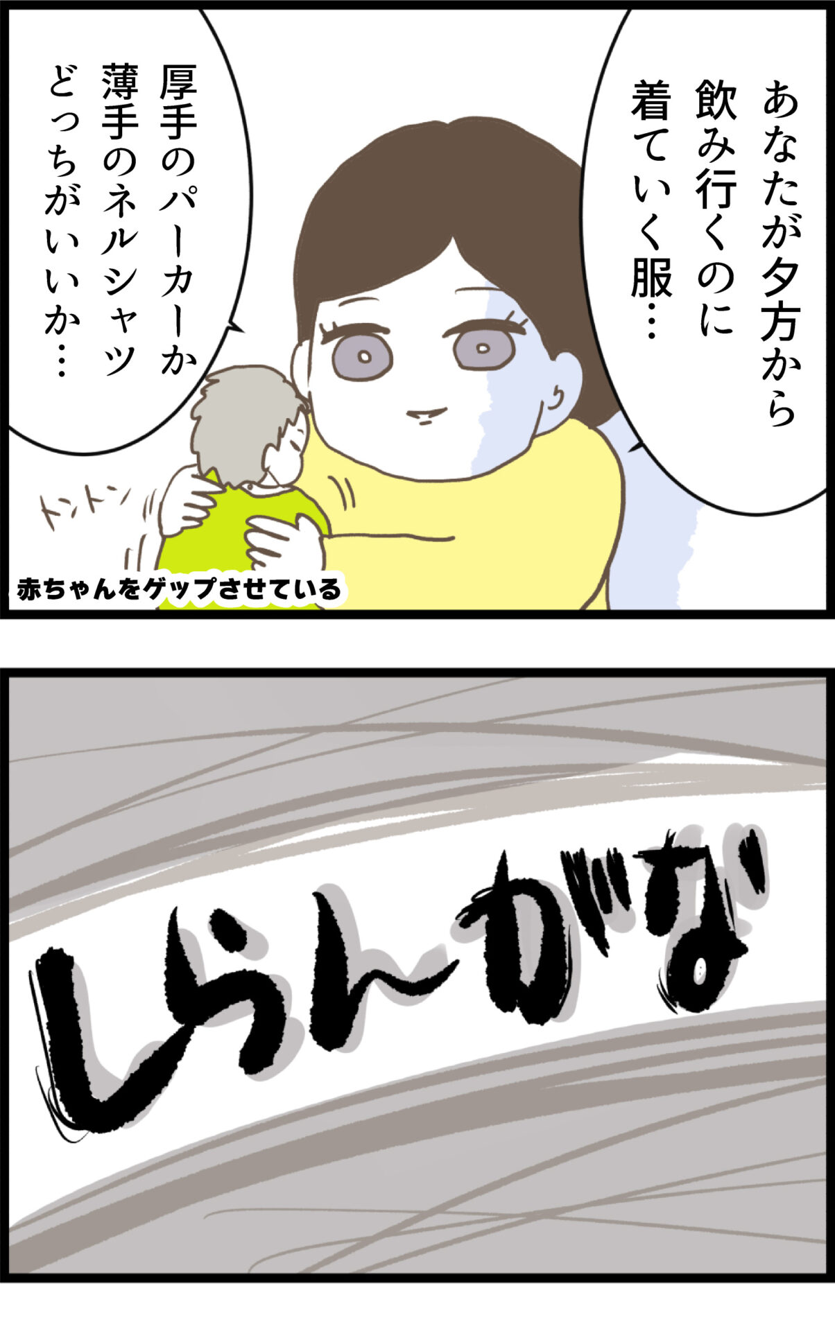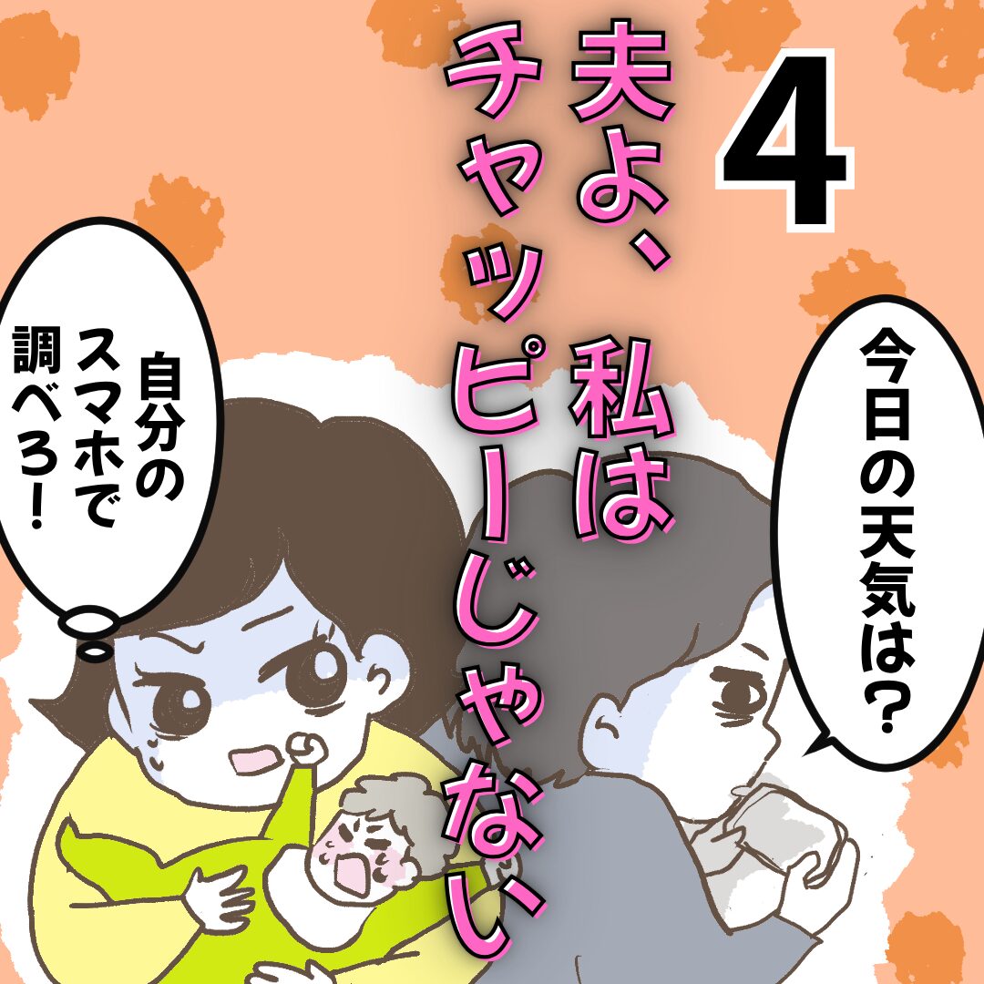 ミルクの作り方を「調べるのが面倒だから教えろ」と開き直る夫・えいじ。さらに「チャッピーなら何度聞いてもキレない」と呆れるような言い訳をした挙句、懲りずに自分の飲み会の服装を相談し続けるのだった。