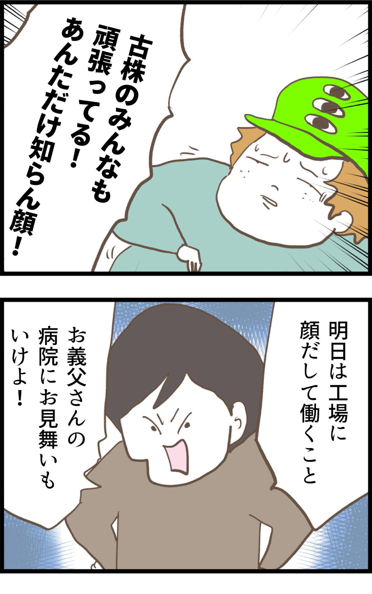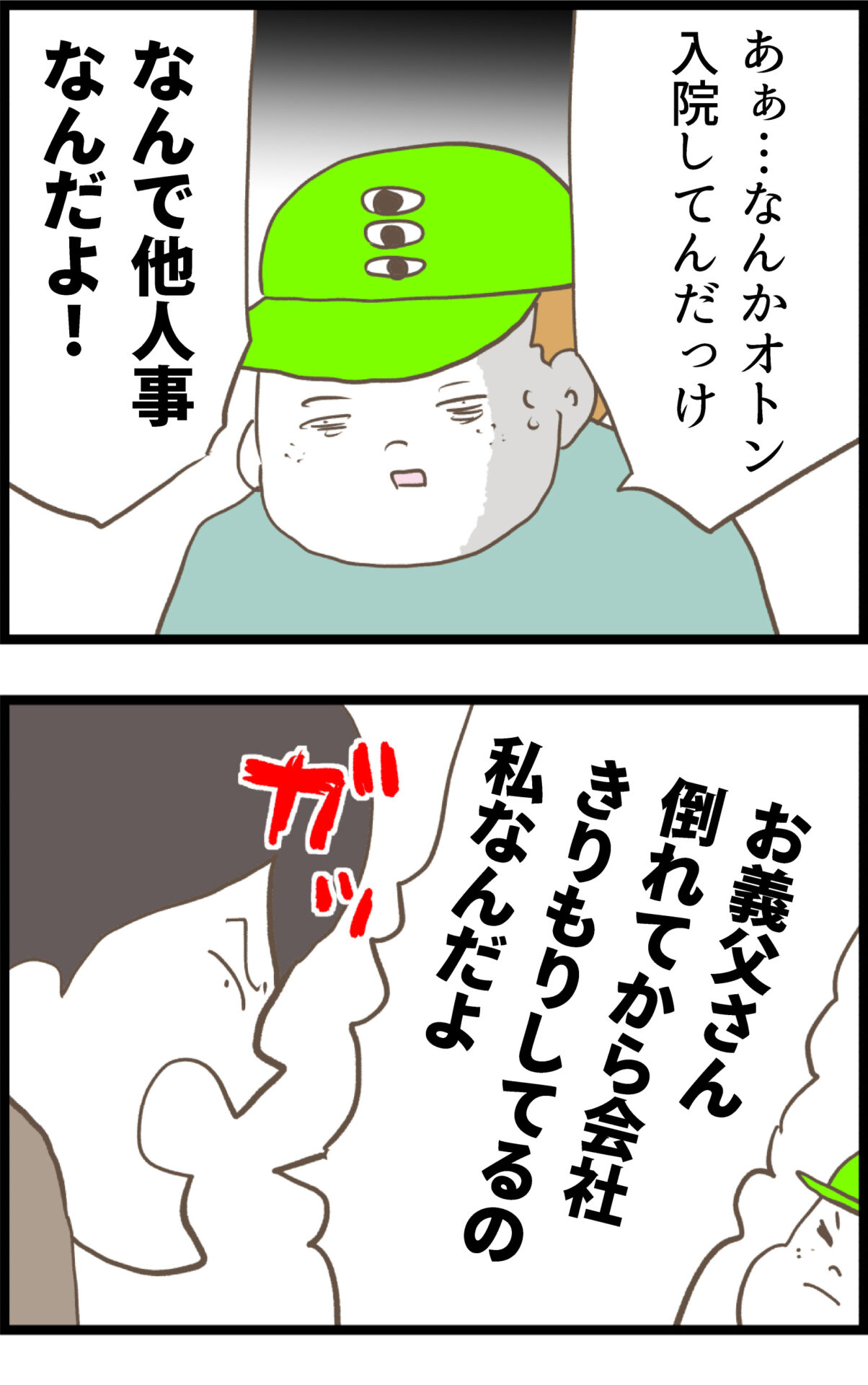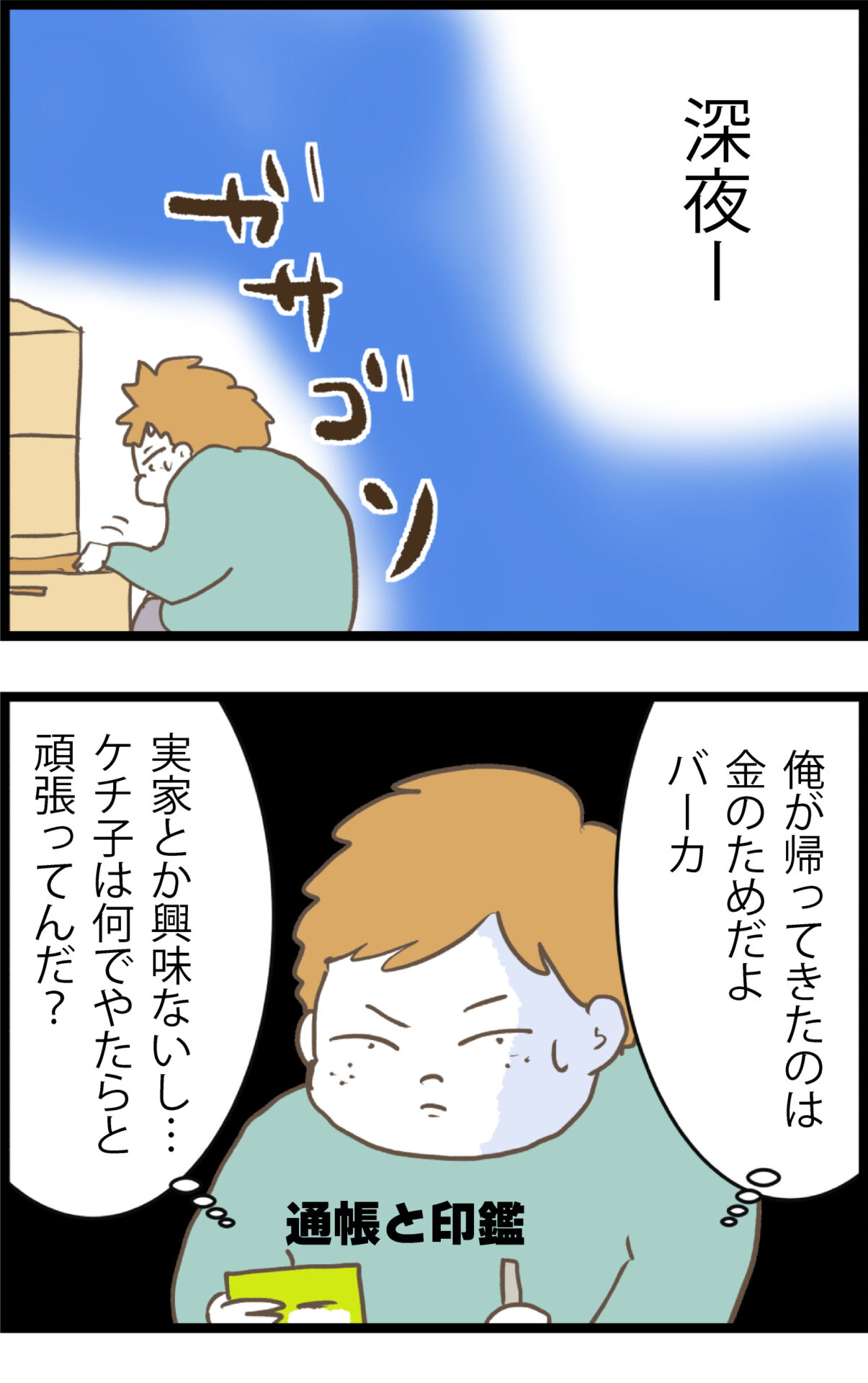 他の女の家に入り浸り、ワンオペ育児中のケチ子を放置する夫。深夜に帰宅した夫は、起きているケチ子を見るなり「顔を見たらげんなりする」と逆ギレし、不倫を指摘されても悪びれる様子はない。身勝手な態度を続ける夫に対し、ケチ子は「何でお義父さんの見舞いに一回も行かないの?」と怒りを込めて問い詰める。