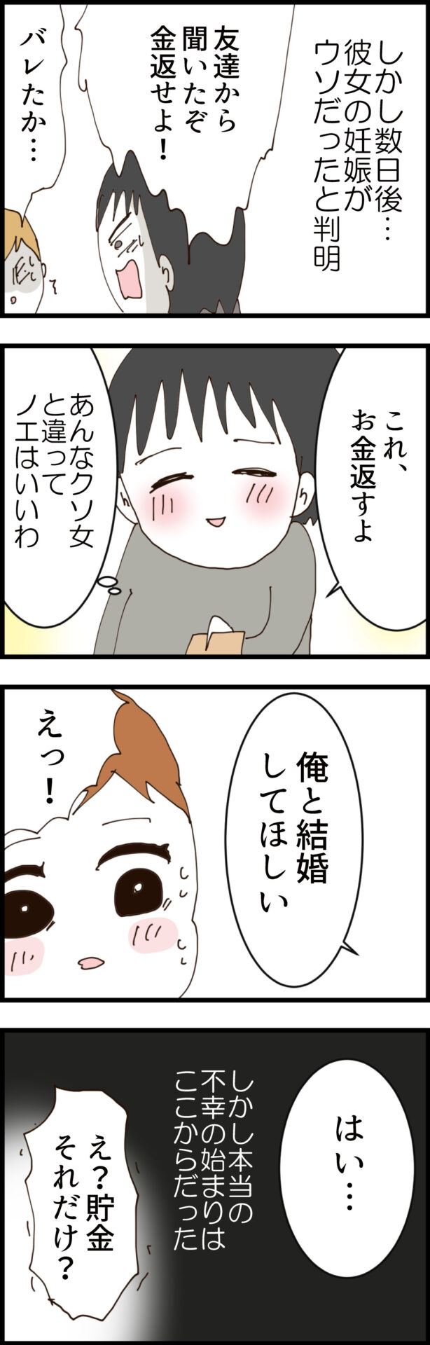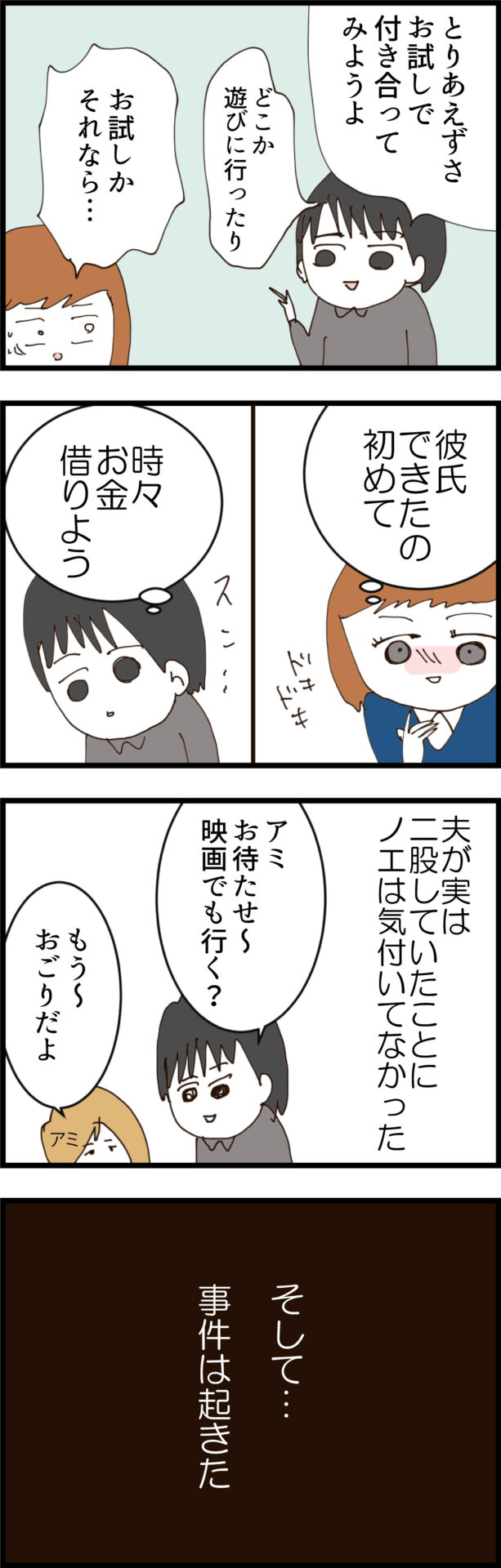 初対面の合コン帰り、「お金を貸してほしい」と無心してきた現在の夫に、人が良いノエはつい5千円を貸してしまう。後日、夫はお金を返すためにノエを呼び出し、「見ず知らずの僕にお金を貸してくれて優しい人だと思った。付き合ってください」といきなり告白してくる。その言葉に心を動かされるノエだったが、彼女は夫が隠し持つ「裏の顔」に全く気付いていなかった……。