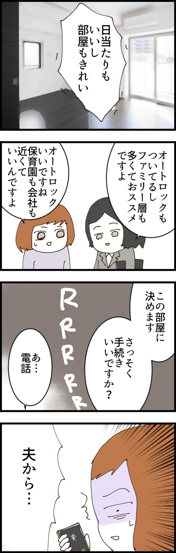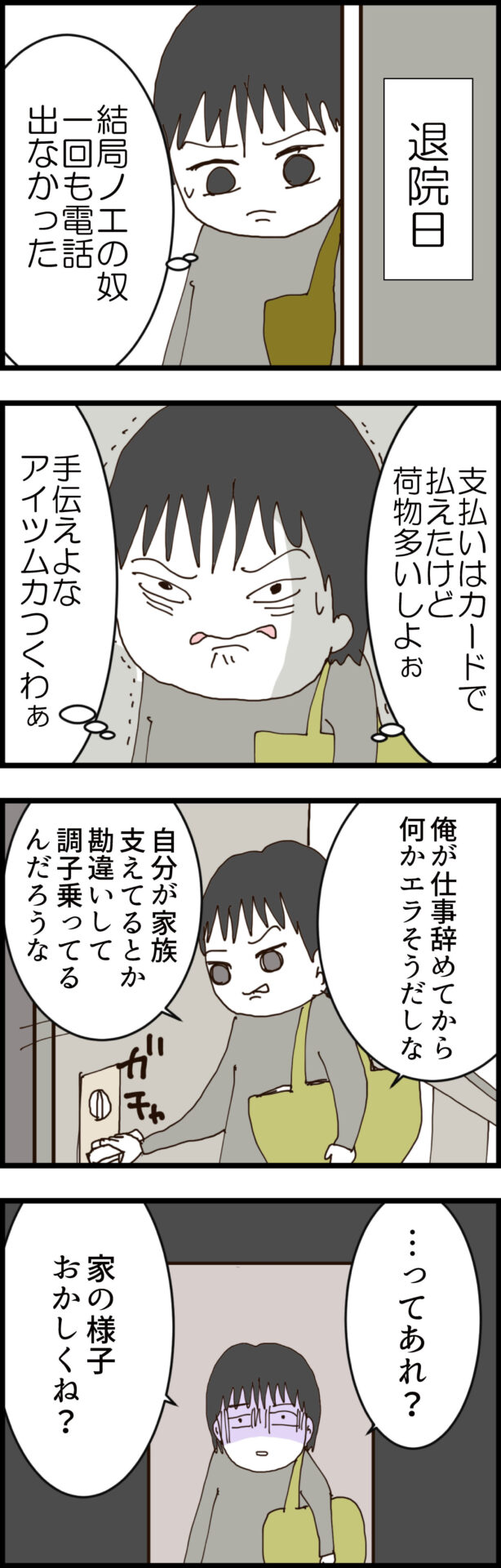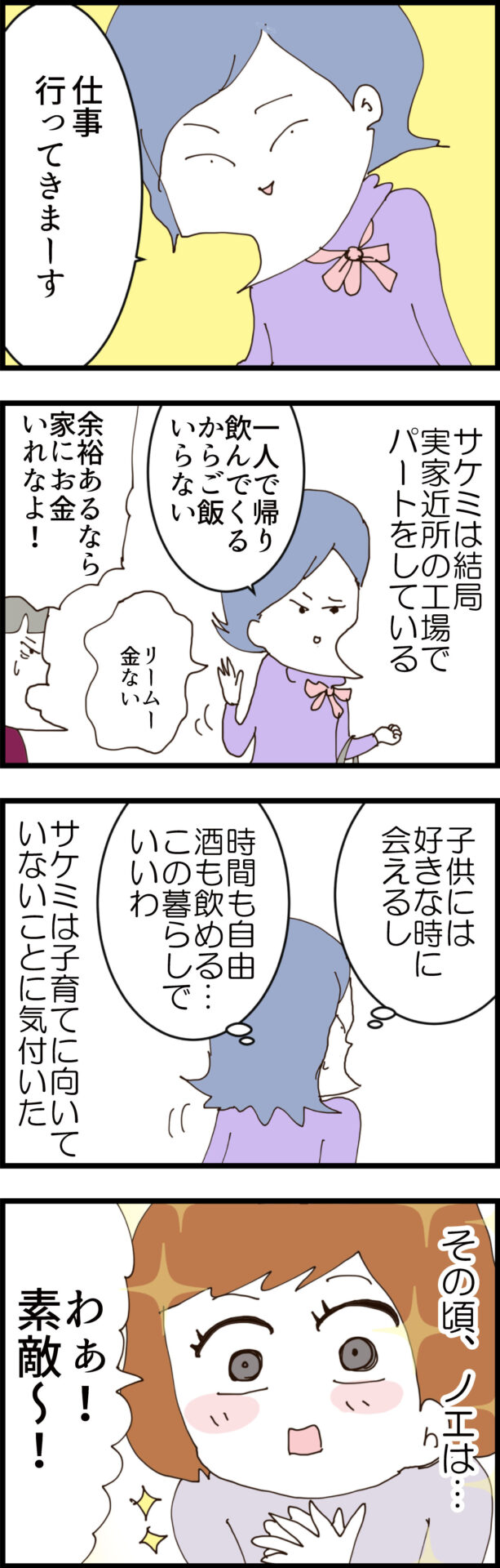 無職のくせに大金を無心してくる夫についに限界を迎えたノエは、「退院したら今度こそ離婚する」と突き放し、密かに本格的な家探しを決意する。一方、逃亡先で追い詰められていたサケミは、涙ながらに抵抗するもついに観念し、離婚届にサインをした。こうしてサケミはついに離婚したのだった……。
