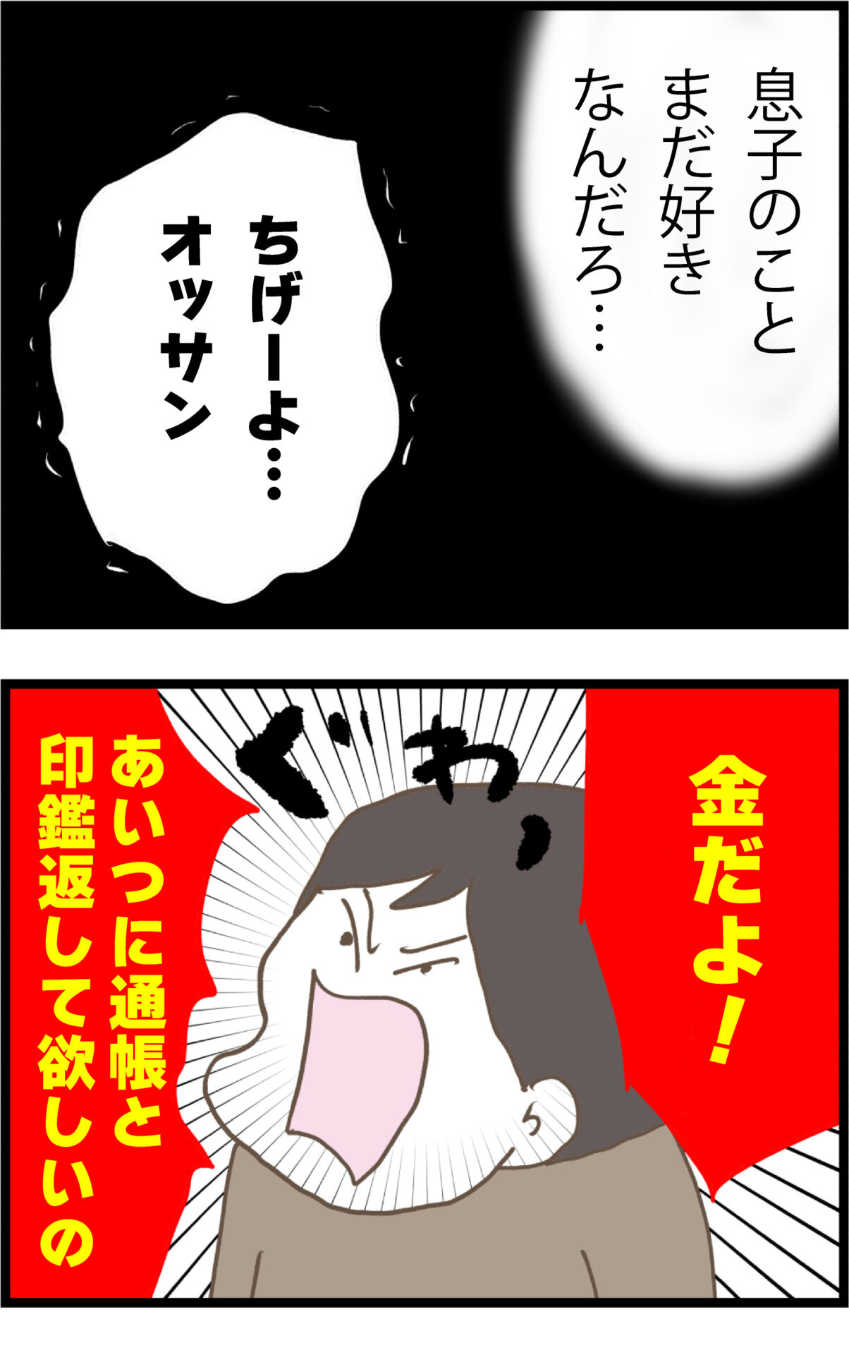 通帳と印鑑を夫に盗まれたケチ子は、義父の病室でついに「あの男にもう耐えられない」と訴える。義父は離婚を承諾しつつも「まだ息子のことが好きなんだろ、もう一度話し合ってみたら」と提案するが、ケチ子は全力で否定。